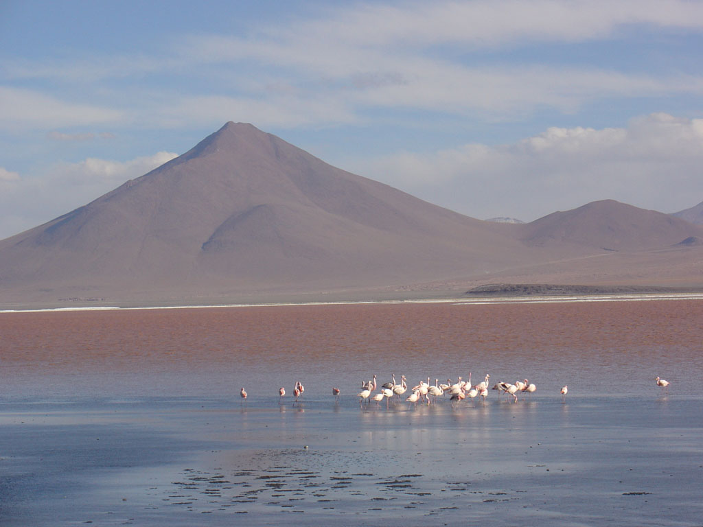 Caminhámos lentamente até ao mirador para ver os flamingos. Parece repetitivo: montanhas, lagoas e flamingos. Mas nunca o sentimos assim. Repetitiva só a surpresa. Aqui as águas possuem uma cor incrível e inexplicável. Ou melhor, a explicação para a cor acastanhada e vermelho sangue encontramo-la nos pigmentos de algas que pululam no fundo das suas águas, ao lado de minerais como o bórax que se encontram à beira da lagoa, mais parecendo, vistos de longe, pequenos glaciares.