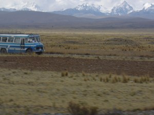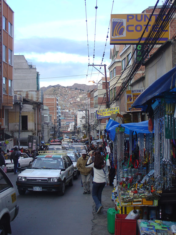 Voltando ao início do dia, a viagem desde Puno começou bem cedo pela manhã, com uma paragem de uma hora para almoço em Copacabana, até à retomada da jornada em outro autocarro para La Paz. Deu para sentir as diferenças nas estradas do Peru (pelo menos as da zona do Titicaca) em relação às da Bolívia, estas últimas muito piores mesmo quando asfaltadas. E os próprios autocarros também são aqui bem piores. Chamar mais uma vez turístico ao calhambeque que nos tocou desde Copacabana só mesmo tendo na ideia aquele que sai na rifa ao comum do boliviano quando tem de recorrer ao transporte público. O que é praticamente sempre. Quase ninguém tem, obviamente, carro particular e pelas ruas de La Paz, para além dos táxis, o que se vêem são centenas de vans que vão fazendo o transporte dos passageiros de uns bairros e zonas da cidade para as outras. Vai um motorista e, ao seu lado, um fulano apregoando o destino e cobrando a entrada de quem for entrando. Isto faz com que a banda sonora oficial das calles de La Paz seja qualquer coisa como a conjugação de uns gritos estridentes de “Miraflores, Estádio, Villa Pavon, Avaroa, Obrajes, Calacoto, Los Pinos, El Alto”.