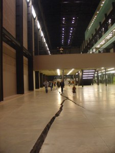 Desta vez a ocupação desde mega espaço foi entregue a Doris Salcedo que aqui trouxe “Shibboleth” e à entrada avisa-se qualquer coisa do género “cuidado onde põe os pés, não caia no buraco”. A artista resolveu apresentar um trabalho que se inicia com uma estreita fenda no chão que se prolonga pela dita centena e meia de metros e que a meio do caminho se vai alargando tanto que se torna mesmo possível que um pé inteiro (ou os dois) lá caiba dentro. Salcedo, colombiana, diz que pretendeu representar as fronteiras, a experiência dos emigrantes e sua segregação, a visão de uma pessoa do 3.º mundo que vem até ao coração da Europa (afirmou ao Sunday Times “It represents borders, the experience of immigrants, the experience of segregation, the experience of racial hatred. It is the experience of a Third World person coming into the heart of Europe. For example, the space which illegal immigrants occupy is a negative space. And so this piece is a negative space. http://entertainment.timesonline.co.uk/tol/arts_and_entertainment/visual_arts/article2617536.ece)