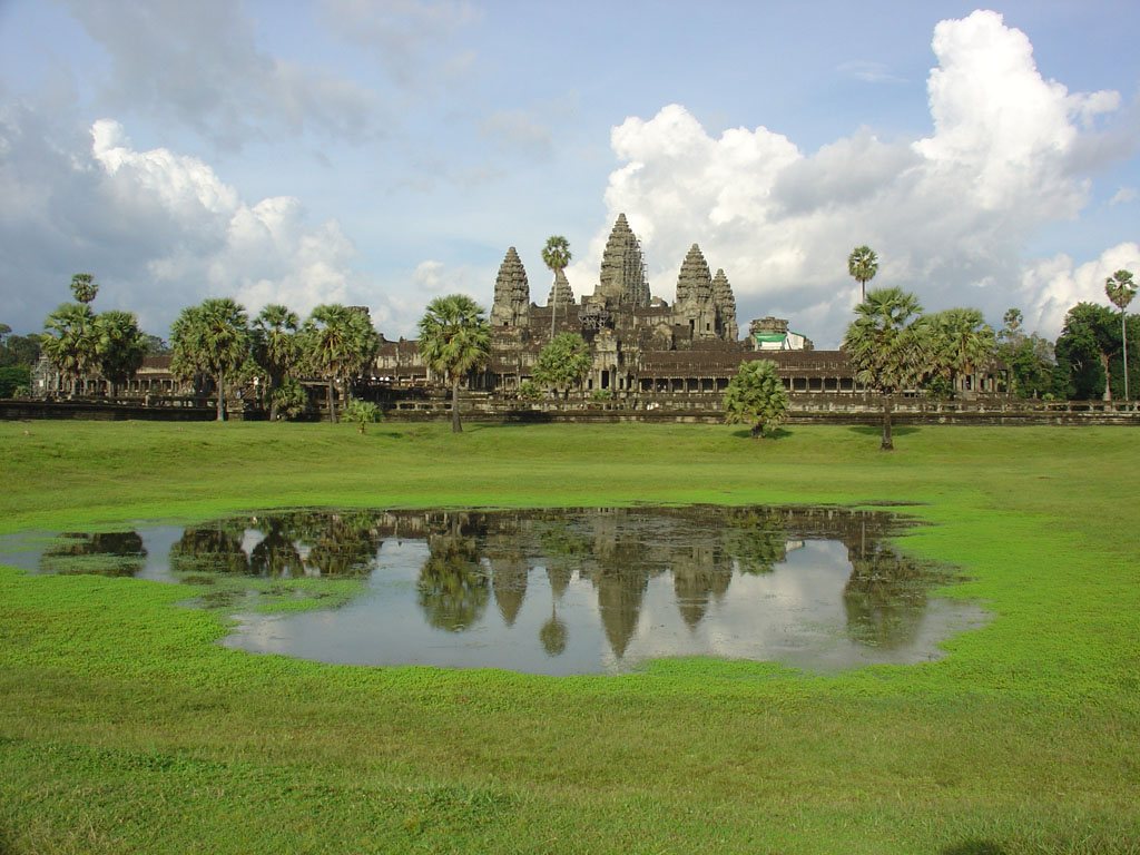 Construído entre 1113 e 1150, em honra de Vishnu, divindade hindu, quando a capital do império se mudou para Phnom Penh ficou entregue aos monges budistas. Foi o único templo no meio da floresta que cerca Angkor a nunca ter sido abandonado e ter sido objecto de peregrinação desde sempre. Tendo em conta a sua orientação para oeste, simbolicamente a direcção da morte, há quem defenda que a sua função original seria a de mausoléu. Certo é que é considerado o maior edifício religioso do mundo.
