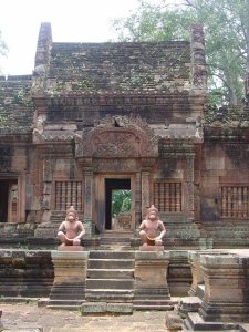 Banteay Srei é provavelmente o mais lindo e adorável templo de Angkor, considerado a jóia da coroa da sua arte. Dedicado a Shiva, divindade hindu, é também designado como a “Cidadela das Mulheres”. O arenito na sua construção toma tonalidades rosa e na pedra encontramos talhados pormenores decorativos muito bem trabalhados, delicados e encantadores. Apesar das figuras dos guardiões (ou por isso mesmo…), não foi à toa que em 1923 Andre Malraux, que viria a ser ministro da cultura francês foi apanhado e preso por tentar “guardar” umas quantas estátuas e esculturas deste templo.