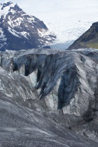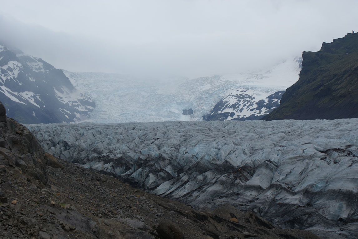 Ainda assim, o Svinafellsjokull também é escuro em muitas das partes onde os iniciantes fazem a sua caminhada. Apesar de retirar algum encanto ao azul intenso que normalmente nos vem à ideia quando pensamos em glaciar, esta situação é absolutamente normal e deve-se aos sedimentos que se vão soltando da terra quando o glaciar a invade. Ao retrair-se traz consigo estes sedimentos. Todavia, encontramos ainda muitas crevasses (fendas naturais que são abertas nos glaciares), mais ou menos largas, mais ou menos profundas, mais ou menos de um azul cristalino que nos faz sonhar. Ao mesmo tempo, este é um dos grandes perigos para quem se aventura em andar por cima do glaciar, poder escorregar e cair num buraco do qual se poderá não conseguir sair. E com tantos glaciares mesmo ali juntinho à estrada, sem esforço de maior para os alcançar, há que ter cuidados redobrados com as aventuras. Sair da estrada rumo à beira do glaciar, sim, mas não cair na tentação de o subir sem equipamento e acompanhamento adequado. O que até nem é muito difícil pois só vê-los ali de perto já nos enche as medidas.
