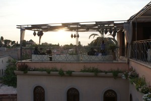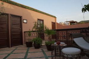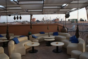 Para passar a noite – e também o dia sem que sintamos isso como um desperdício – a melhor opção é um riad cheio de charme na Medina. Les Jardins de Mouassine (http://www.lesjardinsdemouassine.com/index.html), junto à mesquita de mesmo nome, foi a nossa (acertada) escolha. No primeiro piso fica o lounge e uma pequena banheira para o relaxe do dia turístico pela cidade. No segundo e terceiro piso os quartos, cada um com o seu nome. Neste último, existe um inacreditável terraço, parte exclusiva do nosso quarto, com espreguiçadeiras, bancos e um barzinho (onde é servido o pequeno almoço). Não possui vista para a cidade daí que seja ainda mais difícil imaginar não só o bulício, mas também o emaranhado de edifícios ocre sem interesse de maior que nos rodeiam.