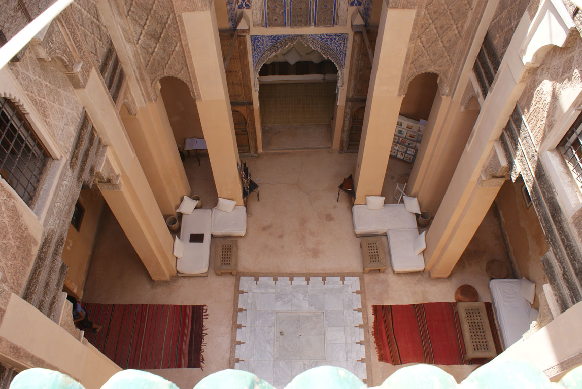 Porque o verdadeiro interesse em Marraquexe está no interior dos seus edifícios, mesmo naqueles perdidos num qualquer beco de uma das suas ruas. Como é o caso do Dar Cherifa (http://darchrifa.blogspot.com), bem pertinho do riad Les Jardins de Mouassine (apesar das inúmeras voltas que demos para lá chegar). Mais um para a lista dos inacreditáveis, mais um edifício que ninguém daria nada por ele. E mais um pleno de carácter, acertadamente transformado em lugar para se estar a ler enquanto se aguarda por uma refeição ligeira. Possui igualmente um terraço onde apetece estar sem ser na hora do calor, e a subida até lá é imperdível para se ter uma real noção do espaço que é característico da arquitectura de Marraquexe.