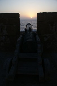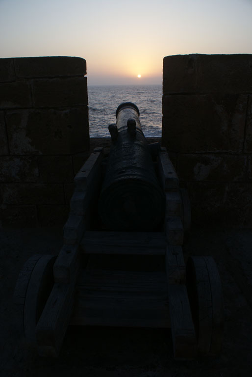 Como sexta-feira amanheci com uma má disposição incrível (talvez uma quase gastroenterite), a única coisa que conheci de Essaouira foi os bancos de pedra que iam surgindo pelo caminho e que eu rapidamente ocupava para me deitar um pouco. Como ao fim da manhã as tonturas persistiam, desisti dos meus intentos turísticos e recolhi-me à caminha do meu riad para apenas dela sair para ver o por do sol no mar junto aos canhões da fortaleza.