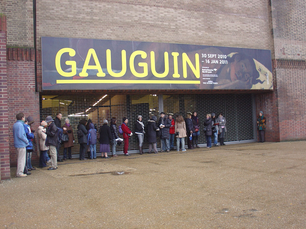 Hoje iniciei a manhã pela exposição do Gauguin na Tate Modern. Cheguei vinte minutos antes das 10:00 e como boa britânica fiz gala em estar na bicha para pacientemente esperar pela minha entrada. Quer dizer, quando a porta abriu o espírito paciente foi-se e desatamos – eu e os companheiros de bicha – a correr para não perder o bilhete da concorrida exposição.