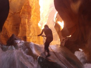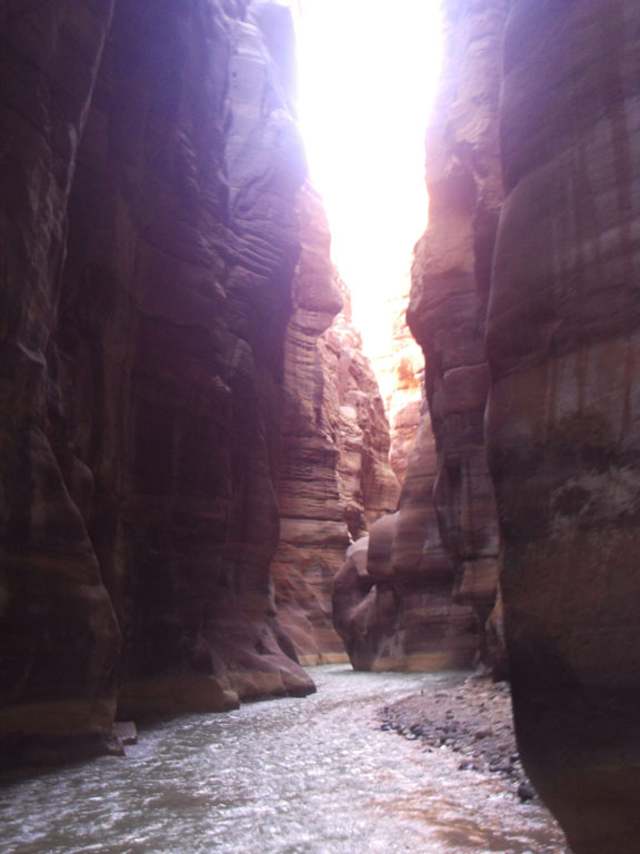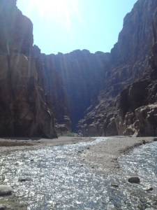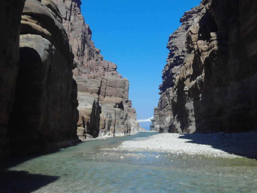 Porquê o nome de “Petra na água”? Porque os seus mais populares trilhos são feitos na água e porque a paisagem é extremamente parecida com Petra. Wadi quer dizer “vale”. Percorremos, então, um vale encravado num estreito com penhascos iguais aos de Petra, com as mesmas cores e tudo. O trilho mais fácil e o único que dispensa um guia é o Siq Trail, cerca de um 1 km que termina numa queda de água fantástica e poderosa. Se se conseguir subir ou de qualquer forma atravessar esta queda de água, mais sítios fantásticos se descobrirá. Digo isto porque, para se chegar até esta queda de água, há que perseverar, aventurar, ser criança de novo e vencer os vários desníveis de terra e de água que se vão sucedendo, subir pedras e descê-las como se estivéssemos num tobogã. Eu que sempre me recusei a fazer canyoning dei comigo frente a um sem esperar. Mas foi muito divertido.