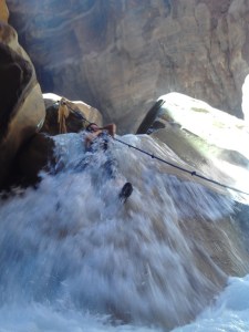 Ainda assim, esta experiência logo no começo das férias esteve à beira de as estragar. Na descida de uma das pedras maiores e que envolvia uma queda na água um pouco turbulenta aqui a míope deixou cair os óculos. Pânico… como descobri-los naquela torrente de água que ora fazia redemoinhos junto à pedra, ora a fazia correr em direcção ao próximo desnível? Vá que pelos vistos os miúdos jordanos são determinados e Ahmad não perdeu tempo em, mesmo de mão no nariz, mergulhar e achar os meus óculos. Obrigado Ahmad.