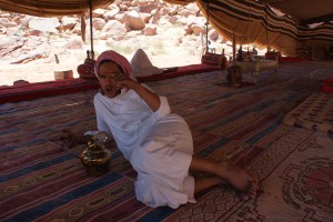 Wadi Rum, a terra dos beduínos não é assim tão cosmopolita. Vêem-se alguns, poucos, turistas nos jipes para lá e para cá, contornando as rochas, as dunas, as tendas do chá e das recordações turísticas. O condutor que nos calhou, que não era guia, era um verdadeiro beduíno totó. Salam não perdia a oportunidade de a cada paragem tirar a sua almofadinha e deitar a descansar um pouco na areia debaixo da sombrinha de um rochedo. De inglês, com esforço, conseguia dizer hello.