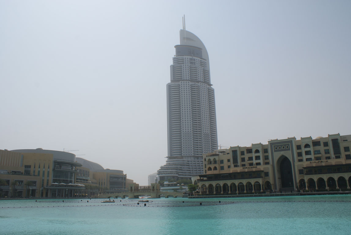 Cá fora do Mall e a circundá-lo, bem como ao Burj Khalifa, fica um lago artificial com um azul irreal e que também ele parece artificial. O que acontece é que também a água do mar tem esta cor e parece mentira. Mas aí, não há como negá-lo: é mesmo real. Aos fins de tarde, aqui neste lago existe um espectáculo coreográfico e musical na Dubai Fountain. São poucos minutos mas intensos, onde a maior dificuldade é arranjar um espaço no meio da multidão. Ultrapassado este passo, é relaxar e ver a água a jorrar do lago, como se os seus jactos quisessem alcançar o Burj Kalifa.