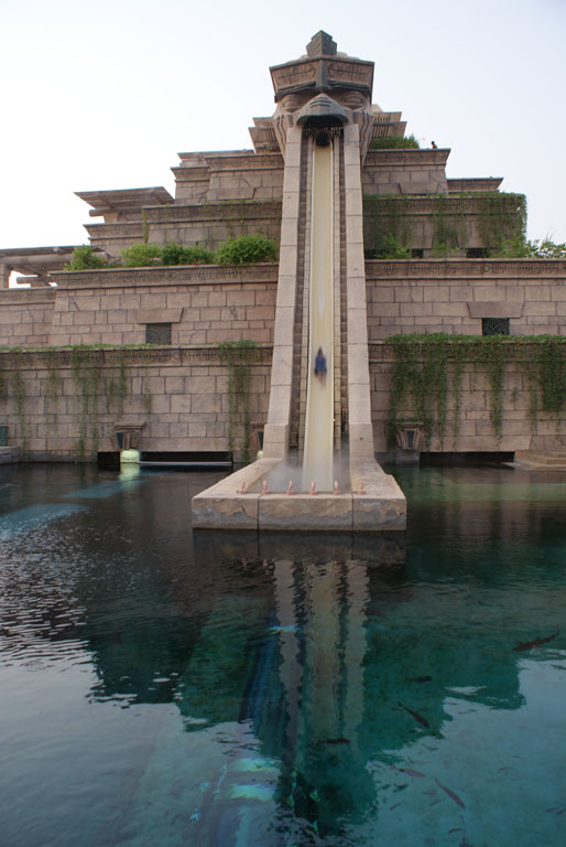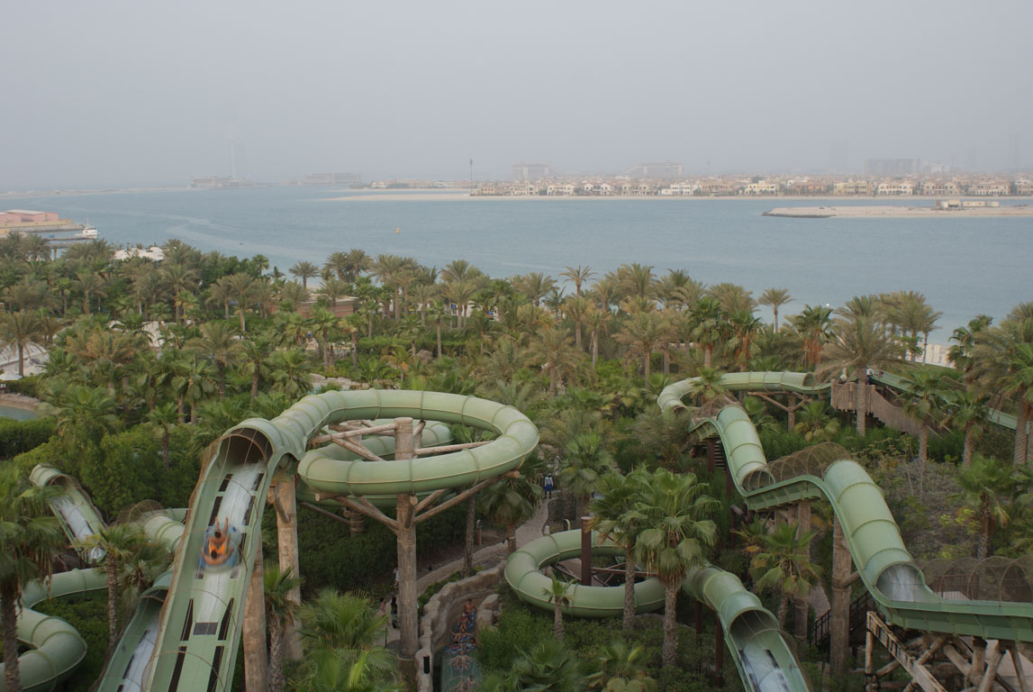 As duas manas experimentaram o tal Aquaventure, carregadinho de locais e turistas. É um parque aquático com praia privativa e vista para toda a cidade. Não fosse a neblina carregada e veríamos claramente o Burj al-Arab e conseguiríamos apercebermo-nos dos detalhes da Palm Jumeirah. Quando à experiência de descer os escorregas direi que não deve haver nada de mais louco que se possa fazer por aqui do que descer um tubo de cerca de 27 metros, sempre recto em direcção ao fundo da piscina que nos espera, com toda a vista do New Dubai mesmo diante de nós. Infelizmente, este foi o relato da vista do Ziggurat que a mana me fez. Não que eu não tivesse esperado os mesmíssimos 40 minutos para descer o tobogã, não que não tivesse lidado com a mesma ansiedade de estar numa fila para uma queda a pique, não que não tivesse enviado o mesmíssimo berro para o céu quando me vi a cair para o vazio. Acontece que fui o caminho todo com os olhos bem fechados e bem agarradinha ao meu corpo, não fosse ele sair disparado ou corresse o risco de ser comido pelos tubarões que vagueavam no aquário mesmo ao lado do tubo subaquático por onde passamos – diz que foi assim, porque aqui ainda continuava com os olhos fechados.