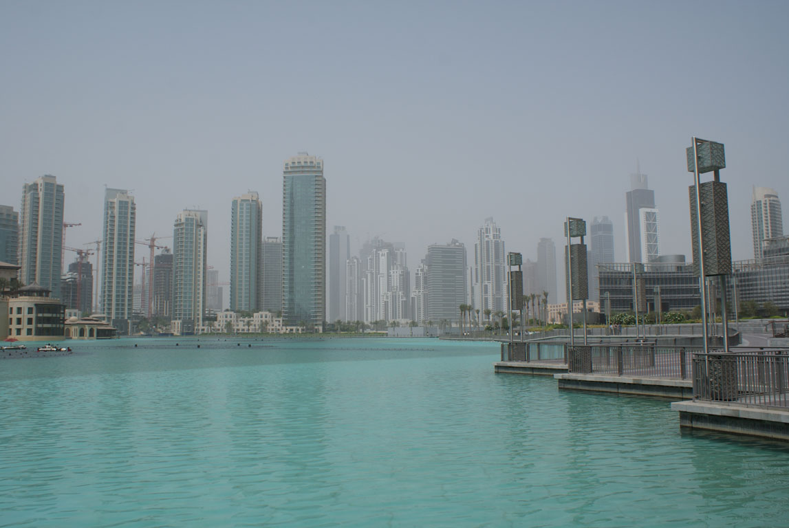 Construção em altura não é sinómino de sufoco – para além da água do lago, o Burj Khalifa ainda tem a companhia do verde das árvores