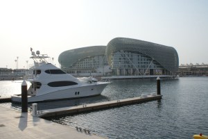 Não muito longe dali, na direcção contrária ao centro da cidade, fica a tal ilha artificial que acolhe um GP de F1, a Yas Island. O circuito está instalado numa marina, com vilas e um hotel no meio. Um hotel lindíssimo, há que acrescentar. Para quem gosta do desporto automobilístico, deve ser fantástico estar no deck de um barco, na varanda de uma vila ou no terraço do hotel a ver os carros passar em alta velocidade com o seu vruumm, vruumm característico.