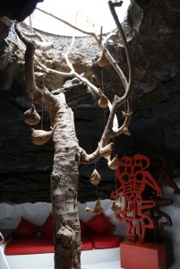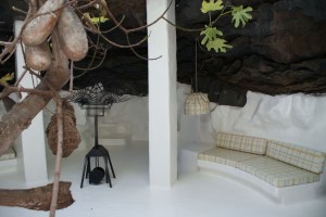 No piso inferior vemos o aproveitamento dos buracos criados na terra pela lava, as “borbulhas”, umas decoradas com mobiliário, designadamente sofás e mesas, brancos, outros vermelhos, outro ainda com as paredes em preto. Tudo espaços para serem vividos, seja a confraternizar com amigos, seja sozinhos com nós mesmos (ou Manrique sozinho, que parece que já estou a fazer da sua casa minha), com um buraco natural no tecto que deixa entrar a luz suficiente mas, incrivelmente, mantém a área fresca.