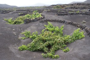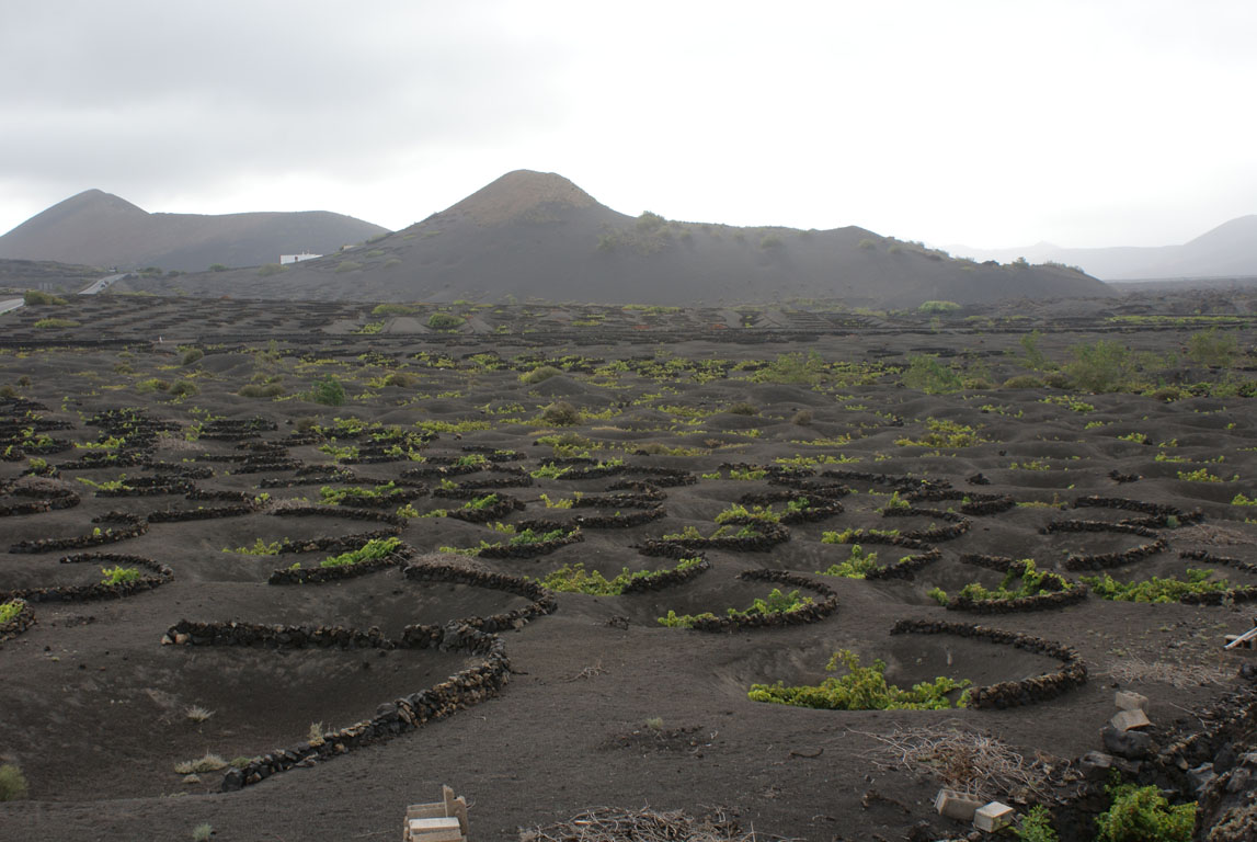 Ainda perto do Timanfaya fica outra das surpresas de Lanzarote: os campos de vinha do Vale de la Geria. A terra preta é envolvida em círculos de pedra basáltica recheados de vinha, dando um efeito lindíssimo o contraste do verde desta com o preto da areia. No entanto, apesar de esteticamente resultar na perfeição, esta técnica tem motivos mais práticos como o de proteger a vinha do vento e do forte sol, servindo a cinza para impedir a evaporação da água.