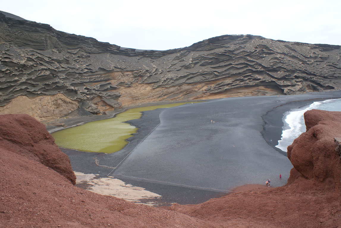 Mas o castigo transforma-se em idílio e encantamento poucos kms ainda mais acima. El Golfo é um daqueles milagres da natureza difíceis de acreditar e de entender. Numa praia de areia pretíssima a relação do mar com uma cratera criou uma lagoa de água amarela (ou verde). Como se já não fosse suficiente desejarmos ficar o dia todo a olhar para esta maravilha verde (ou amarela), o cenário dá-nos ainda uma montanha com formas incríveis e cores avermelhada para compormos a nossa pintura mais que perfeita.