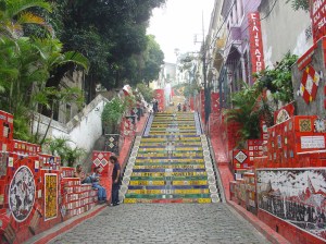Mas aí perto fica a escadaria Selaron que nos faz esquecer rapidamente tudo o resto. Um artista chileno que vai enchendo uma escadaria enorme de azulejos desenhados e pintados por ele, em nome do amor que tinha por sua mulher já falecida e do amor bem vivo pelo Rio. Um portento de imaginação.
