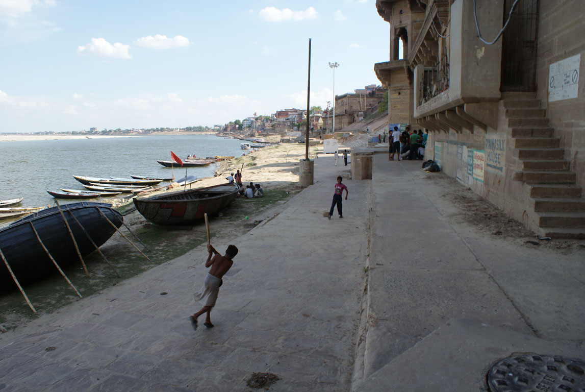Ao longo de cerca de 6 kms estendem-se dezenas de ghats, as escadarias que dão acesso ao rio. Para dentro fica a cidade fervilhante de confusão, das ruas estreitas onde todos parecem caber: carros – poucos -, autoriquexós, bicicletas, pessoas, macacos e vacas, e bosta destas, muita bosta, há que olhar com atenção onde se pisa. Aqui não há beleza especial, só uma introdução ao que já esperávamos ser a Índia. Mas, aqui como cá, as crianças aproveitam as ruas para brincar. O cricket é senhor e as paredes dos edifícios nas ruas estreitas amparam a bola tacada. Pior quando jogam junto aos ghats, pois o destino frequente da bola é a água do Ganges.