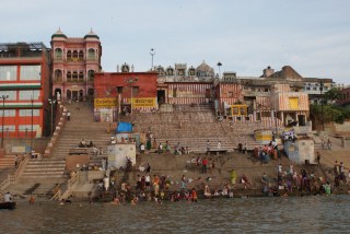 Os melhores momentos para se ver os ghats e edifícios de Varanasi junto ao rio é ao amanhecer e ao pôr-do-sol. Pela luz, claro, mas sobretudo porque é nesta altura que todos saem para se banhar, para fazer os seus rituais, para lavar a roupa. Todos convivem animadamente, homens e mulheres, muitos mais os primeiros do que estas, e vacas. Os barcos com os (poucos) turistas e (muitos) indianos vão passando junto aos crentes, tão perto que quase é possível partilhar as suas preces, as suas braçadas na água, levar até com os espirros da roupa molhada que está a ser lavada a bater nas pedras.