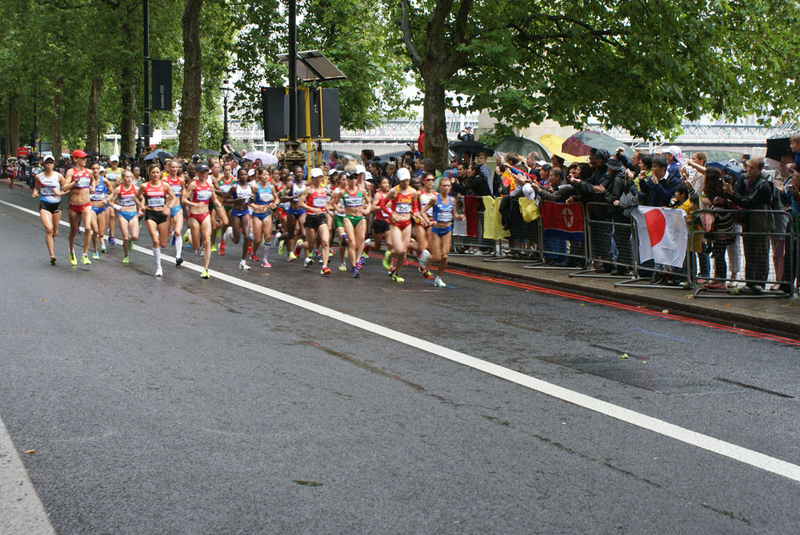 A maratona feminina estava marcada para domingo, dia 5 de Agosto, 11:00 horas. Antes das 10:00 já estava onde planeara, perto do Big Ben e do Parlamento, quase em frente à London Eye, entre um grupo de peruanas e um de italianos a que se juntaram mais tarde dois escoceses. Rapidamente, por uma daquelas coisas que às vezes penso que só acontecem com a minha cabeça, vi-me debaixo de uma chuvada incrível sem qualquer impermeável, apenas com um pulóverzinho e com uma mochila onde estavam a máquina fotográfica e o iPad. Há que acrescentar que os dois impermeáveis que trouxe para Londres ficaram comodamente instalados no apartamento da mesma cidade. E há que acrescentar também que não tive outra saída senão desocupar o meu lugar planeado com antecedência e recuar para debaixo de uns edifícios abrigados da chuva. O que me valeu foi que quase todos os meus companheiros de assistência da maratona foram também eles uns mariquinhas com medo da chuva e, já apenas sob uns pingos, pude voltar para o meu lugar, ainda que um pouco mais apertadinha.