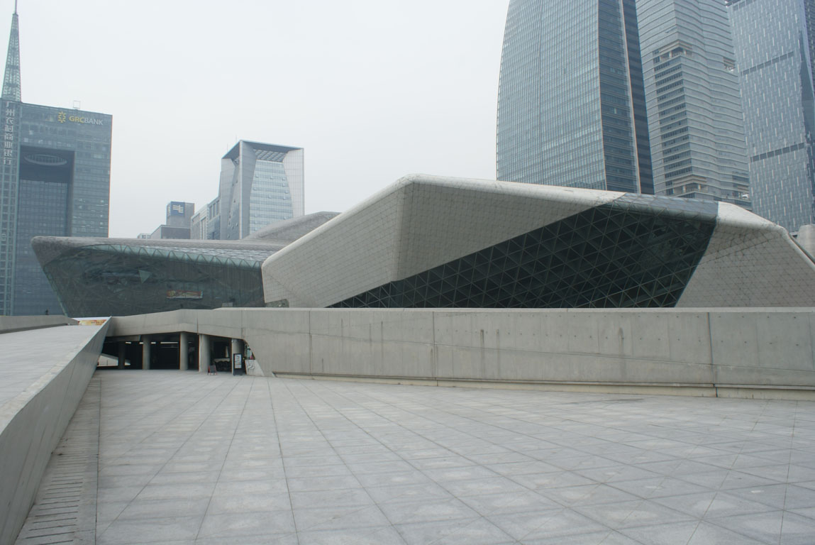 Já disse que o meu objectivo era ver o Guangzhou Opera House da Zaha Hadid. Mas qual não foi a minha estupefacção quando subo à terra vinda do metro e deparo-me com uma praça imensa cheia de edifícios de uma arquitectura cuidada e arranjos exteriores apelativos aos nossos sentidos, com a dita Torre de Cantão como observatório de toda esta revolução num espaço que agora se tornou nobre. Ou seja, afinal a Opera House da Zaha é apenas um mero figurante entre a Torre de Cantão, o Museu de Guangdong, a Biblioteca de Guangzhou e as Torres Gémeas de Guangzhou (por enquanto ainda uma só). E, afinal, só nesta área imensa, mas apenas uma pequeníssima parte de Guangzhou, era merecedora de um dia inteiro. Resultado: como queria mesmo ver com atenção todos os contornos e formas do edifício da Zaha, percorrendo todo o seu exterior, acabámos por perder aqui umas horitas do nosso dia.