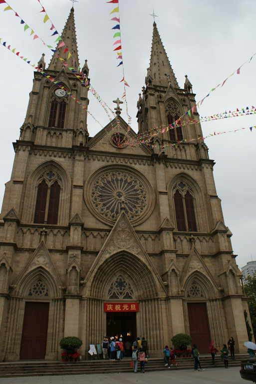 Ora bem. Até aqui tínhamos tido experiências, pode dizer-se, de diferentes épocas em Guangzhou. Começámos com o metro dos nossos tempos, seguido da arquitectura futurista, um pouco mais para trás para a arquitectura dos anos 80 do mausoléu e por fim nos templos de mais de mil anos. Havia de se seguir uma visita àCatedral do Sagrado Coração, precisamente no coração da cidade velha de Guangzhou, construção esta do século XIX, influência ocidental no sul da China em consequência das derrotas autóctones às mãos dos estrangeiros.