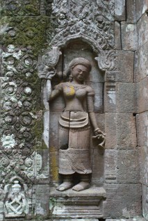 Os dois pavilhões que antecedem o templo principal possuem claramente características que encontramos nos edifícios de Angkor, mas é no templo principal, depois de uma escadaria interminável protegida por árvores portentosas, que damos de caras com esculturas belíssimas cravadas na pedra. Na rochas encontramos ainda esculturas de crocodilo e elefante.