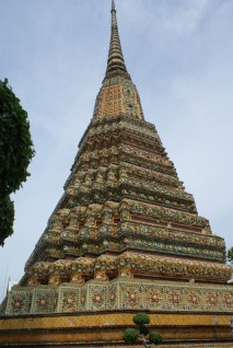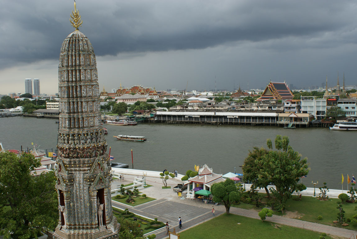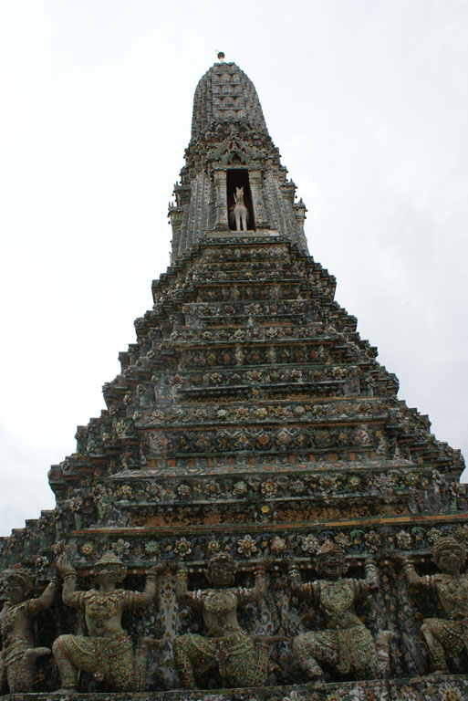 Atravessado o Chao Phraya numa curta viagem de barco estupidamente barata (menos de duas mãos cheias de cêntimos), chegamos ao Wat Arun, mesmo junto ao rio. Do seu topo alcança-se uma vista maravilhosa, apesar de termos de penar um pouco para subir os estreitos degraus. A espécie de torre de 82 metros em estilo khmer parece um pedaço de granito de longe. No entanto, quando chegamos perto vemos que é bela e não bruta, cheia de motivos florais coloridos em porcelana.