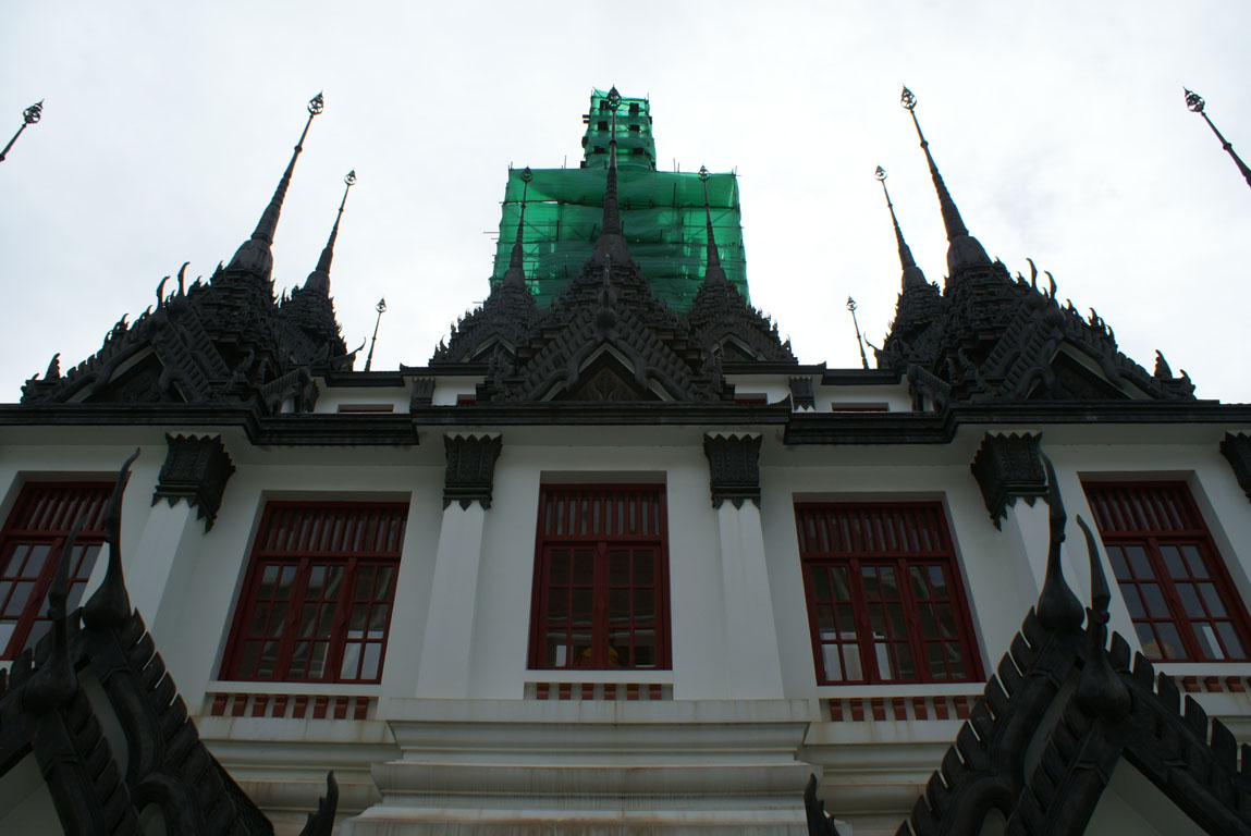 Mas o que mais me encantou por esta zona da cidade foi o Wat Ratchanatda. É antes um complexo de templos, do qual destaco o Loha Prasat, ou Palácio de Metal, a pensar nas 37 esferas de metal que o adornam. O Lonely Planet tem uma descrição curiosa mas acertada: éuma espécie de bolo de aniversário medieval. Pena que estava em restauro, mas deu para sentir a sua arquitectura e estética diferente dos demais. Podemos ainda subir aos seus vários andares e termos uma perspectiva diferente da cidade, como que uma prévia do que veríamos do Monte Dourado.