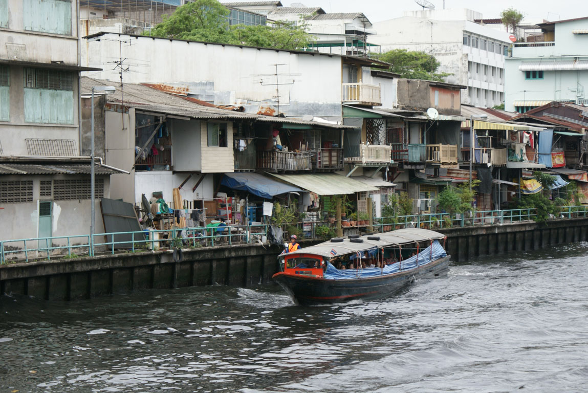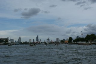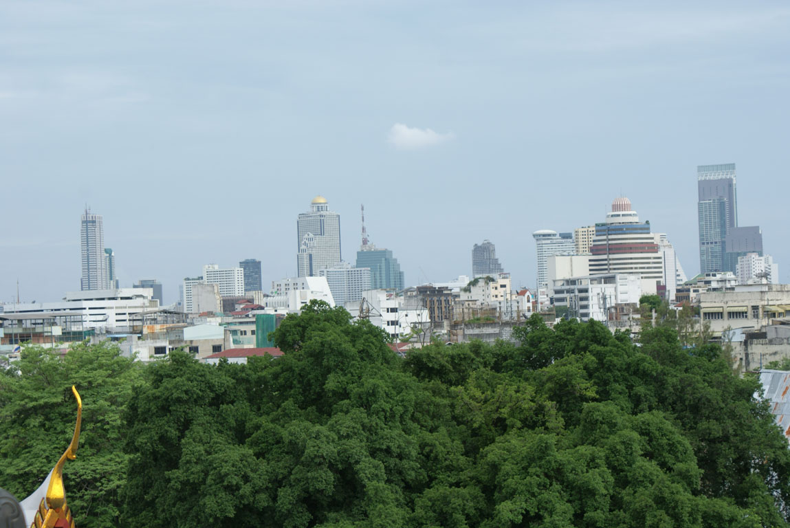 Passando o canal (Banguecoque tem diversos canais, o que faz com que seja conhecida como a Veneza da Ásia), encontramos numa breve subida a stupa no topo do Monte Dourado. À noite fica iluminada, destacando-se na paisagem e sendo um ponto de referência bem bonito. De dia a vista daqui é brutal, o nosso primeiro verdadeiro impacto com a dimensão avantajada de Banguecoque, uma espécie de montanha russa de edifícios, uns baixos, outros médios e cada vez mais arranha céus. Os wats não dominam mais a paisagem. Nesta imperam agora os arranha céus cada vez maiores. A crise económica de 1997 pode ter abalado e parado muita construção, mas a euforia e a pujança parecem estar de volta, a analisar pela quantidade de edifícios que se preparam para romper o skyline sem fim.