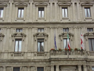 A entrada principal da Galeria é efectuada ou pela Praça onde fica o Teatro Alla Scala ou pela Praça do Duomo. O exterior do edifício do Scala não me pareceu nada de especial. Quem sabe não me possa seduzir pelo seu interior numa das óperas que um dia, quem sabe, lá assistirei. Já o edifício que ocupa o lado contrário da Praça, o Palácio Marino, do século XVI, é especialmente bonito, sobretudo os pormenores da sua fachada.