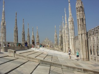 O Duomo de Milão é de uma beleza esmagadora. Conjugando vários estilos, é o gótico que mais sobressai. Uma das maiores catedrais do mundo, começou a ser construída no século XIV e só ficou concluída já no século XX. O seu interior não foi, porém o que mais me seduziu. Foi antes a sua fachada, cheia de esculturas, arcos, esferas e gárgulas. Surpresa maior, não fosse suficiente a elegância e majestade da catedral vista da Praça, é podermos subir até ao seu telhado e por lá caminhar, precisamente por entre as suas esculturas, arcos, esferas e gárgulas. Incrivelmente, estamos a 65 metros do solo e não é a vista da paisagem em volta, que num dia claro diz-se que pode alcançar os Alpes, que ocupa os nossos sentidos. É mesmo a forma, o desenho e os pormenores daquele telhado que nos distraem. Édestino obrigatório para quem está em Milão e Milão deveria ser obrigatório só por esta subida ao telhado do seu maior símbolo.