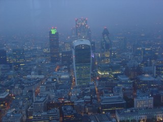 A nossa vista alcança toda a Londres. Se tivermos a sorte de ter um dia limpo e claro deve ser uma experiência inesquecível. A mim tocou-me apenas um dia normal da Londres nublada, mas felizmente sem chuva. Escolhi ir num horário que me permitisse ver o dia ainda com luz, mas aproveitar também o escurecer. Algo que em Lisboa se poderia traduzir por por do sol, mas que em Londres é um bocado estranho. Vi, assim, as luzes dos edifícios da city a acenderem, àmedida que o céu ficava mais e mais escuro.
