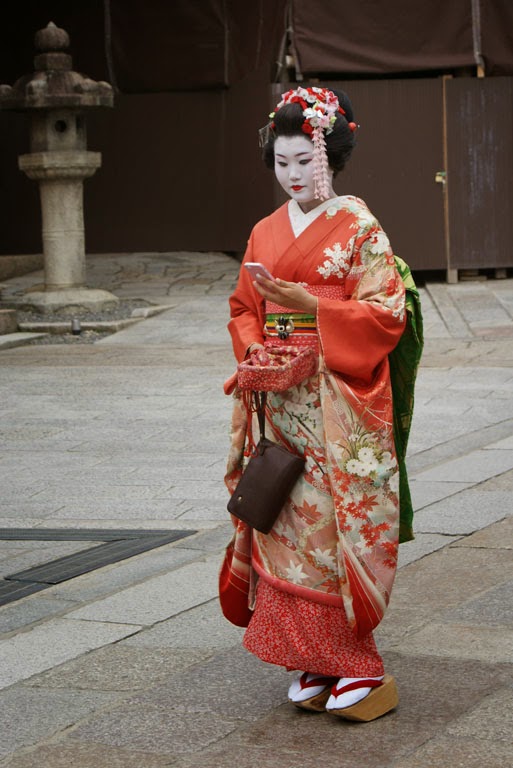 Seguimos para o Kiyomizu Dera, cravado entre as montanhas. Aliás, as montanhas dominam a paisagem de Kyoto, cercando-a e protegendo-a. Este é um local popular e, realmente, estava pejado de visitantes, alguns dos quais casalinhos que pediam uma união forte no Santuário do Amor, um bocado para assim para o género de festa de aldeia. Mas o mais entusiasmante deste espaço é o seu edifício principal e sua varanda perfeita para contemplar as montanhas. Este edifício está assente em 139 pilares de madeira de 15 metros. Pena que outros edifícios estivessem cobertos para restauro. Aqui vimos a nossa primeira – e única – geisha, caminhando arduamente para se aguentar naquelas socas de planta disforme. No entanto, pelo à vontade com que passeava, que de discreto nada tinha, lado a lado com um senhor que mais se preocupava em tirar fotos à paisagem, e não se preocupava que os magotes tirassem fotos à sua companhia, fiquei na dúvida se esta seria um autêntica gueisha. Seria provavelmente uma asiática ávida de encarnar uma personagem de gueisha na cidade onde elas serão ainda mais tradicionais e populares.