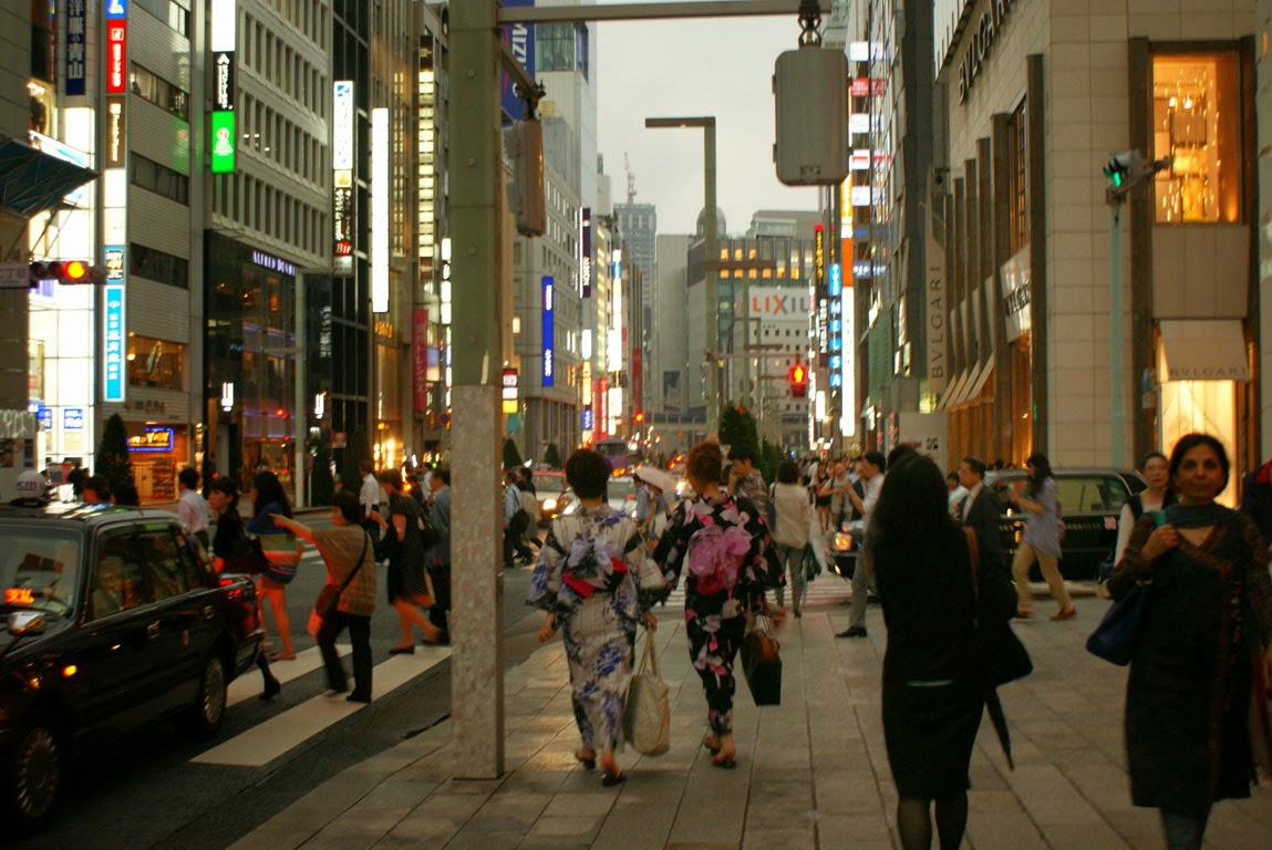 Consumo, arquitectura e movimento são as palavras. As ruas são largas e planas e aqui encontramos alguns edifícios ao estilo ocidental, sendo o mais famoso provavelmente o Wako Tower, o do relógio. Ginza serviu, nos finais do século XIX, de modelo de modernização e urbanização para o novo regime Meiji. Hoje vem sendo ultrapassada no ultra consumismo por outras zonas da cidade que foram, entretanto, surgindo, como Omotesando e Daikanyama.