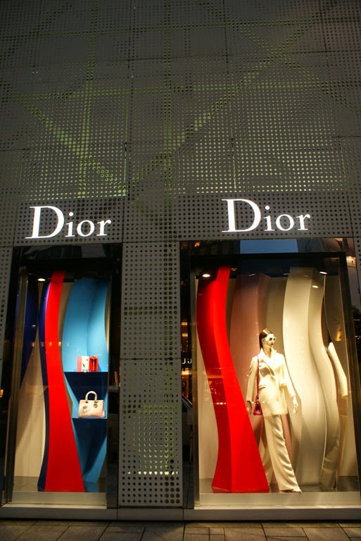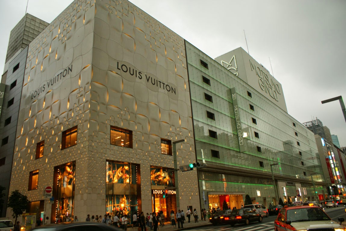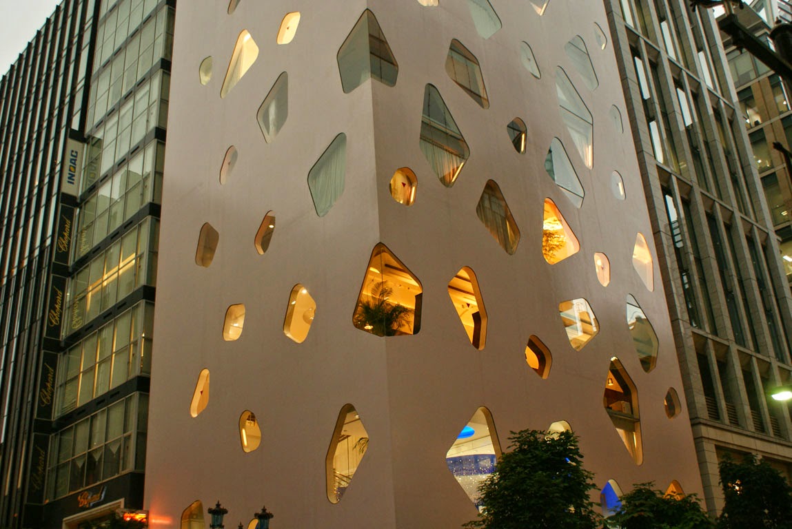 Logo pasmámos com uma esquina com um edifício branco com recortes (Mikimoto) e vimos que, para além dos objectos de marca, havia que deliciarmo-nos com os próprios edifícios em si. Alguns exemplos, entre muitos mais, são o edifício da Loius Vuitton, da Maison Hermes e da Dior.