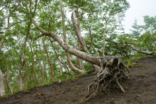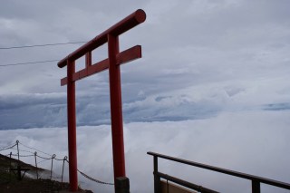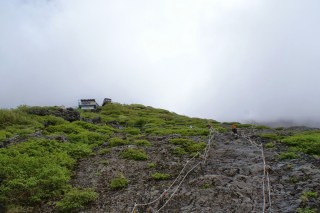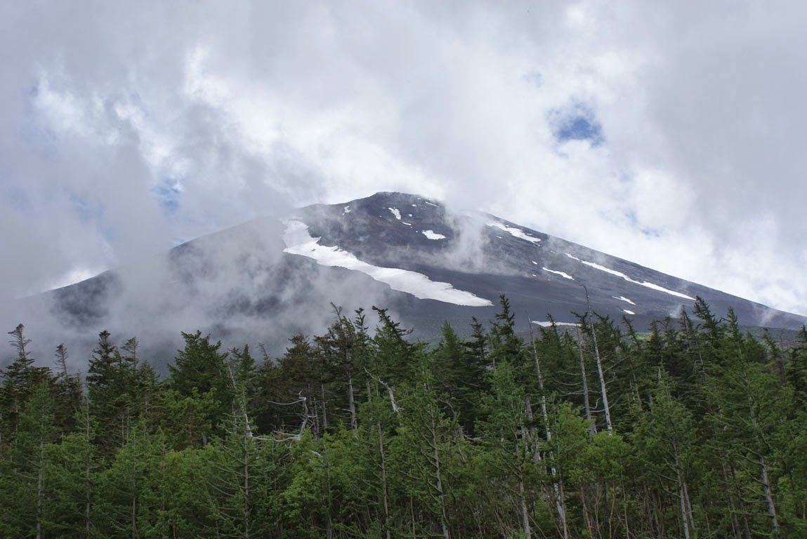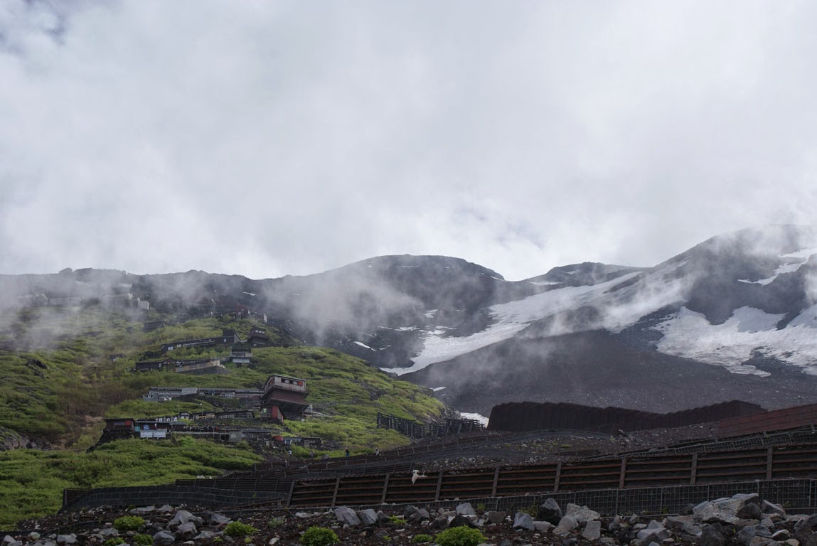 Uma coisa não mudou, porém: a sua ascensão implica alguma devoção. Não que subir ao topo do Fuji-san seja uma missão só para uns poucos Hércules. Nada disso. O trilho está bem marcado, sendo o de Yoshidaguchi o mais concorrido, e vê-se por aqui, pelo menos no início da caminhada na 5a Estação (que há quem a inicie desde mais abaixo), todo o tipo de pessoas. Jovens que parecem estar em boa forma, jovens que parecem ter estreado umas botas / ténis só naquele momento, grupos de adolescentes em excursão da escola, famílias com filhos pequenos, cinquentões já bem entradotes, homens e mulheres. A questão é que os cerca de 7 quilómetros até ao topo, mais ou menos percorridos em 6 horas, são efectuados numa subida constante, nem sempre num terreno fácil. E, depois, há que sobretudo contar com as surpresas da altitude, que os corpos não reagem todos da mesma maneira. No meu caso direi que comecei por apreciar a quase base da montanha, terra negra a lembrar a sua origem vulcânica, mas surpreendentemente cercada de uma vegetação verdíssima. O contraste é mais uma daqueles imagens que não sairão da memória, a juntar a toda a beleza do Fuji-san. À medida que ia subindo, tentando acompanhar o ritmo louco da mana, que certamente deveria querer bater um qualquer recorde (dizer, para antecipar, que não iríamos precisar das 6 horas de média previstas para a ascensão), fui deixando de poder apreciar a paisagem em toda a sua plenitude. Entre uma golfada de ar e outra a atenção a dispensar aos pormenores foi sendo inadvertidamente reduzida.