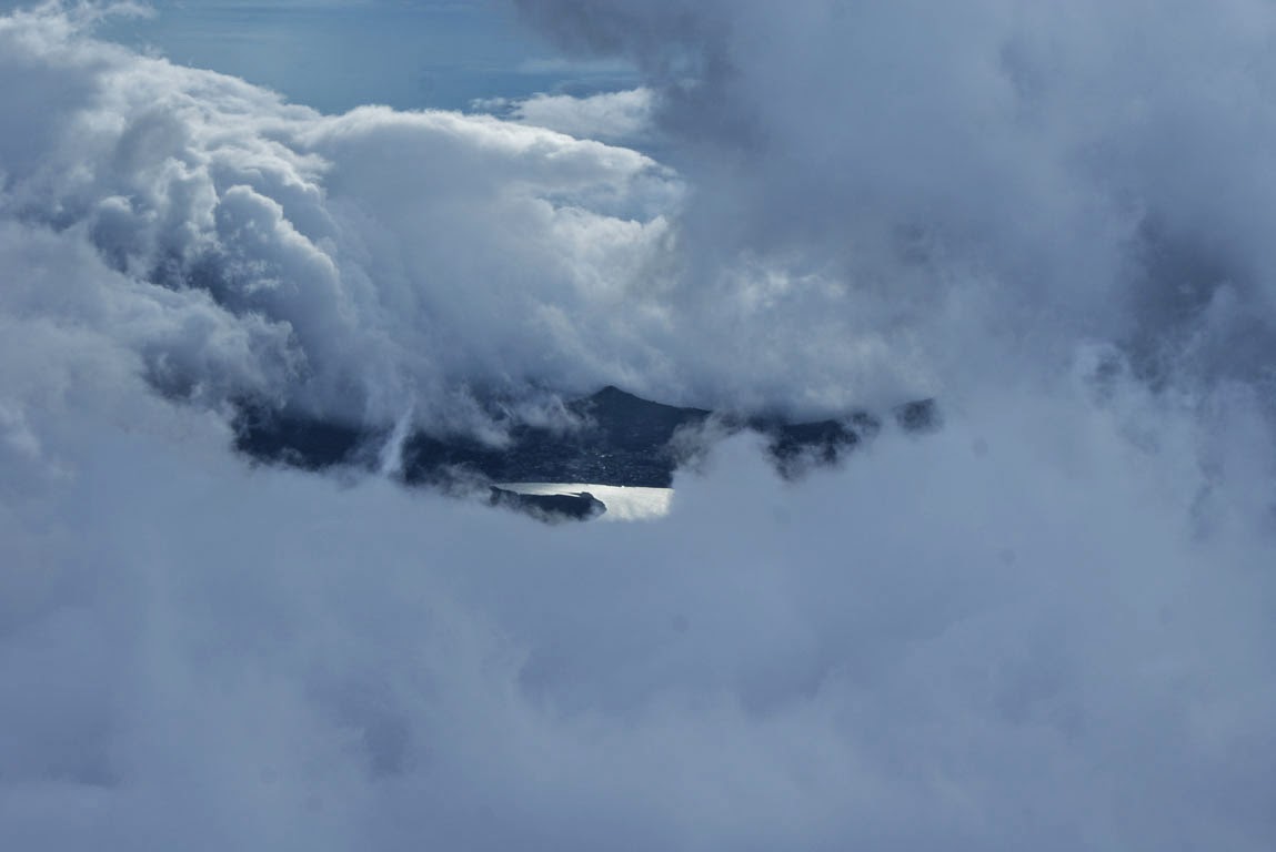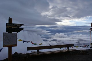Estávamos avisadas de que o clima por aqui muda com muita frequência, daí que mesmo que se inicie a ascensão com sol de 30 graus devamos levar conosco roupa adequada ao tempo frio e de chuva. Ao fim da tarde, a conversa dos rapazes do abrigo (eles vivem ali?) sobre tufão e coisas do género, bem como o facto de meia-hora depois de termos chegado com tempo lindo se ter posto um tempo fechado e chuva, deveria ter servido de alerta. Durante a noite, mal dormida, a sempre corajosa mana dizia-me que estava com medo. Não era para menos. O barulho do vento era arrepiante e o facto de estarmos num abrigo de madeira a mais de 3000 metros de altitude não ajudava. A ideia era: mesmo que daqui a pouco não consigamos subir os 800 metros que nos faltam, como é que vamos conseguir descer os 6 quilómetros já conhecidos?