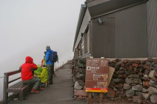 O plano era chegar até à estação 8,5 onde iríamos pernoitar no nosso abrigo de montanha, o Goraiko-kan, a 3450 metros, a apenas 800 metros do objectivo final, a 45 minutos de distância, mais coisa menos coisa. Este é o último abrigo. Chegámos aqui por volta das 18:00, sempre com um dia bom, sem chuva e sem vento, e com necessidade apenas no último quilómetro de vestir algo mais do que uma t-shirt. Ainda tínhamos mais uma hora de luz, mas deixámo-nos ficar ali, a ver as nuvens que se iam pondo abaixo de nós. Jantar às 18:30 e cama logo de seguida, que o despertar estava previsto para as 4:00 da madrugada para ver o sol nascer. O abrigo é uma cabana onde parte é zona comum, onde se toma as refeições, e a outra parte é o dormitório, onde as ovelhas, perdão, as pessoas são colocadas para dormir. Uma vez que este dia não calhou a um fim de semana, nem a época alta estava no seu pico, pudemos dormir a uma distância de cerca de 30 centímetros do colega do lado. Sorte que de um lado eu tinha uma parede e do outro a mana.