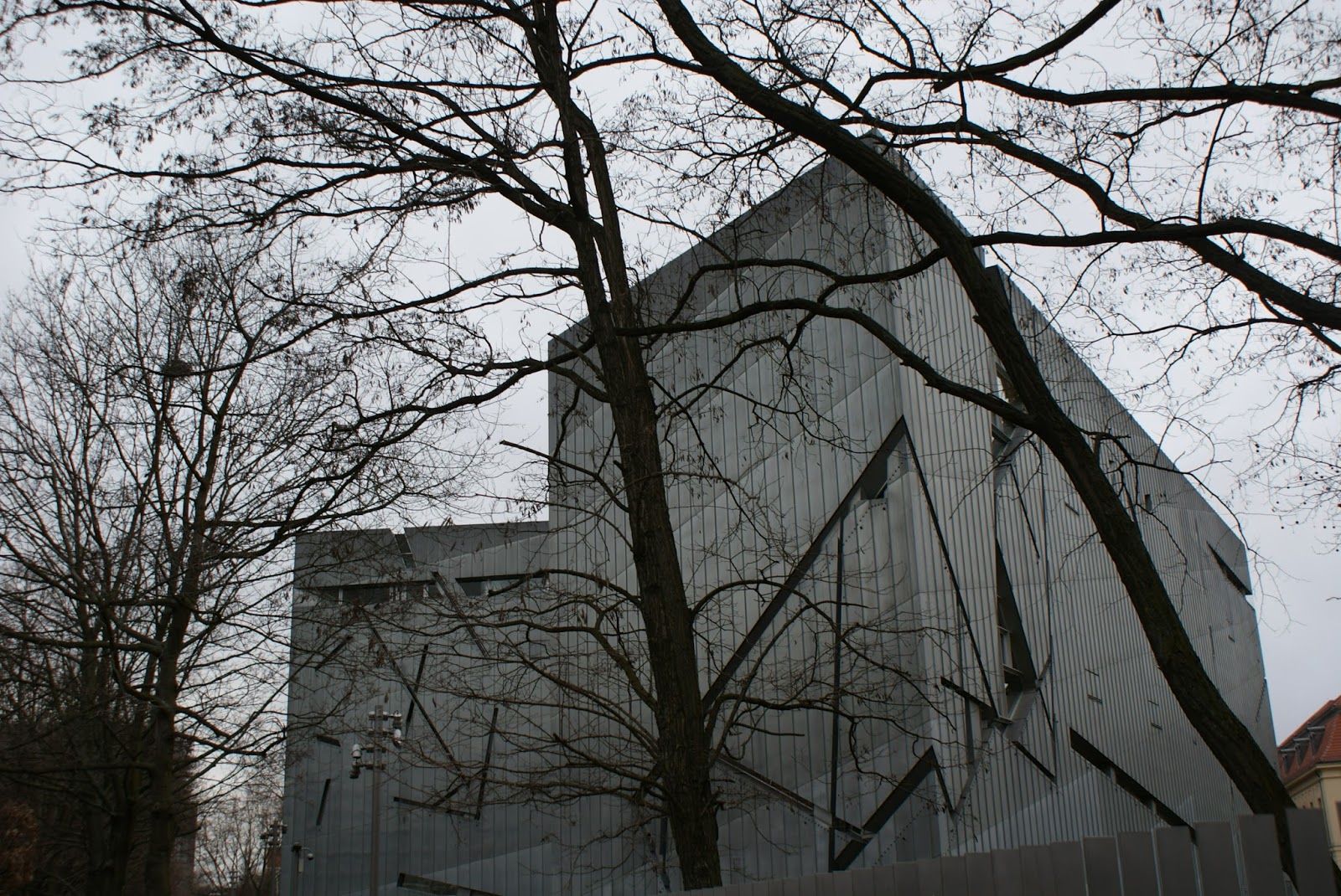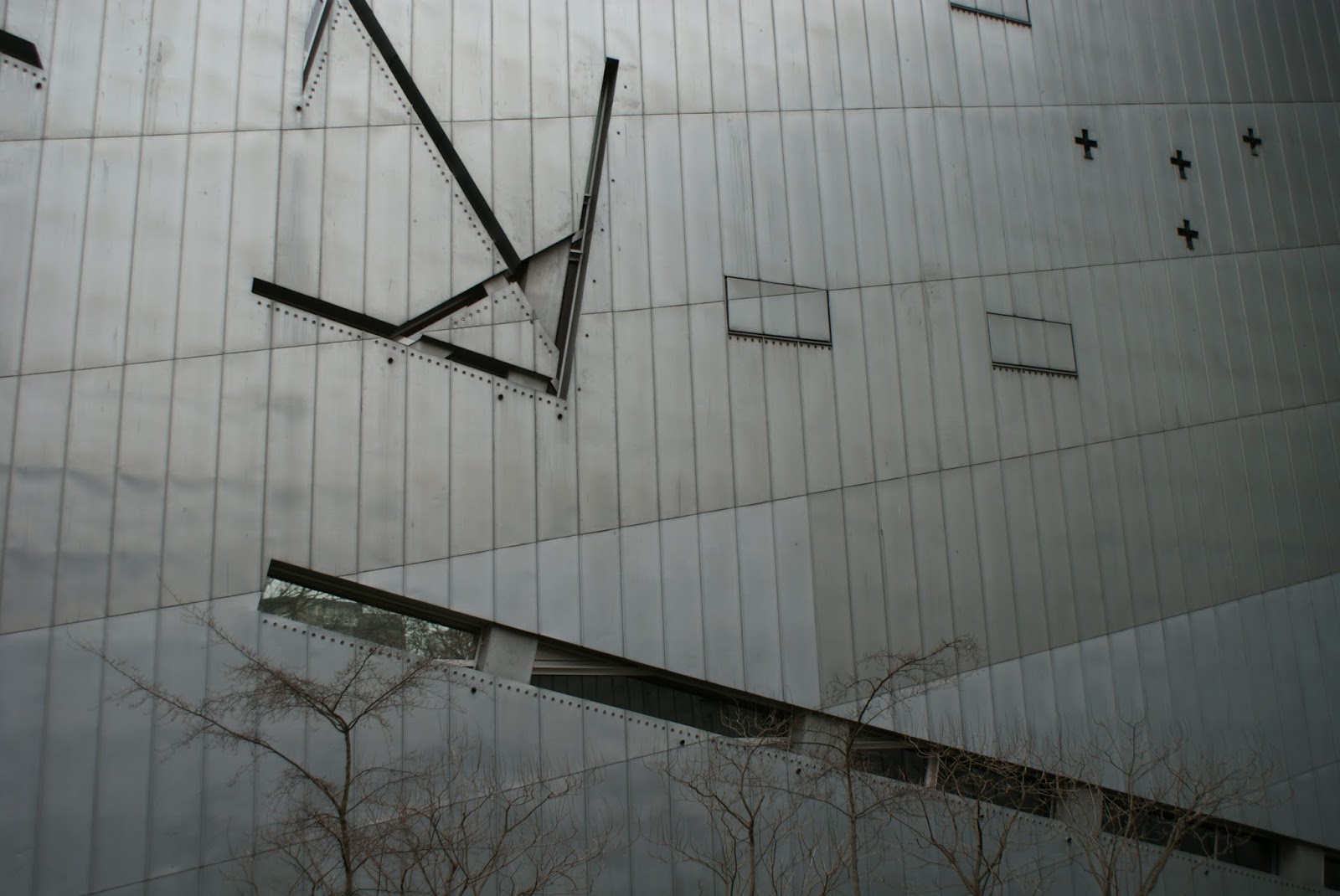 O edifício revestido em chapas de zinco expõe a dureza e rigidez do metal. Caracteriza-se por poucas aberturas para o exterior, sendo que as existentes constituem cortes estreitos em formatos diferentes. Essas aberturas representam a Estrela de David estilhaçada, isto é, Libeskind transformou o signo maior da cultura judaica num símbolo de fracturação e sentimento de revolta em relação à barbárie sofrida pelos judeus.
