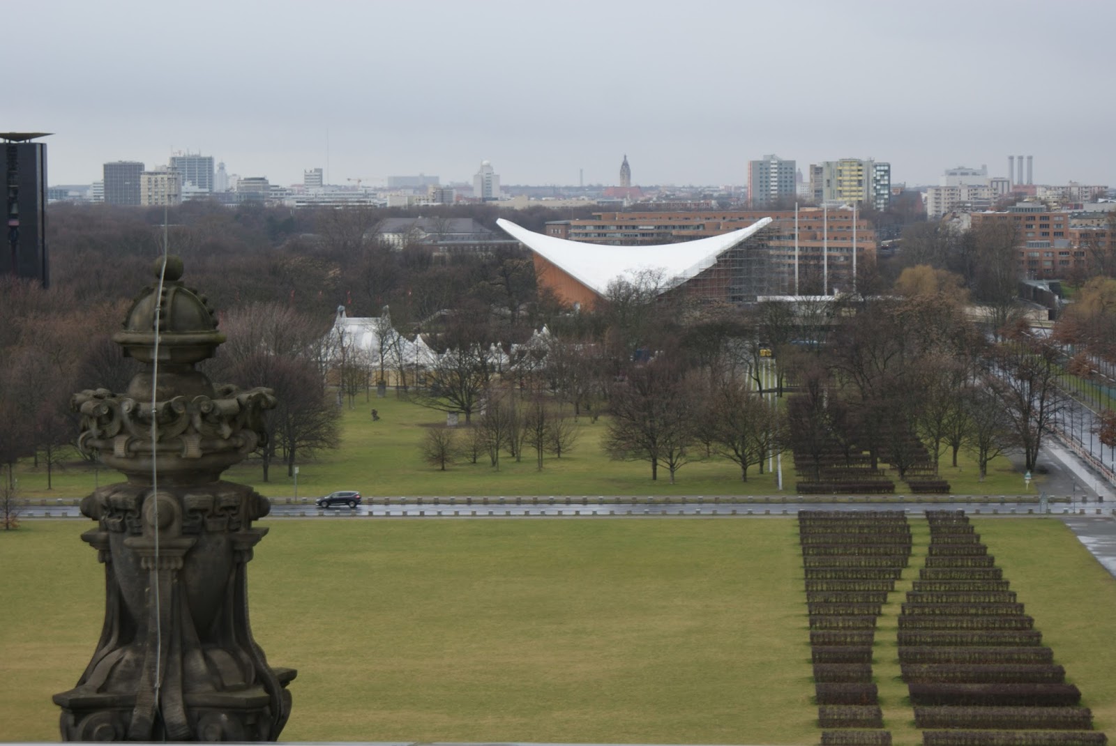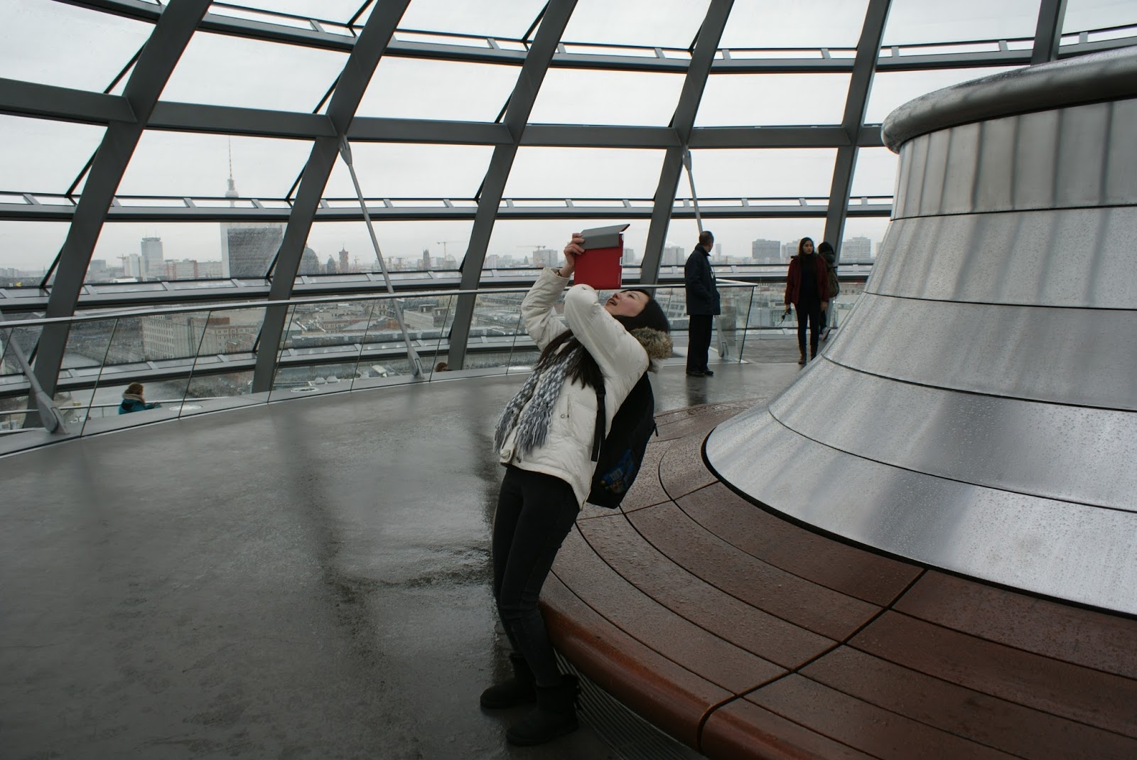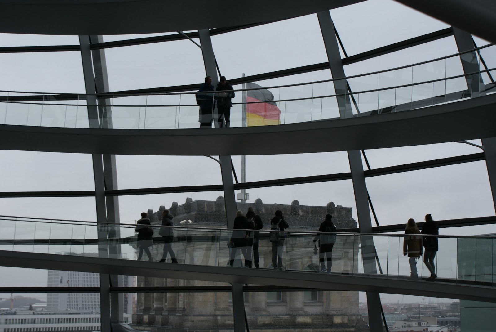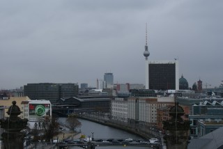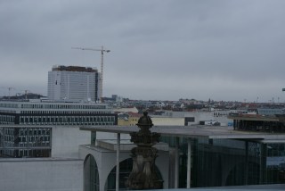 Enquanto subimos a rampa, e nos maravilhamos com a arquitectura da cúpula, vamos recebendo informação sobre o edifício e a envolvente urbana. Aproveitamos também para ver as vistas. De um lado avista-se o elegante edifício da Casa das Culturas do Mundo e o amplo Tiergarten, despido e em tons secos por aqueles dias invernosos.