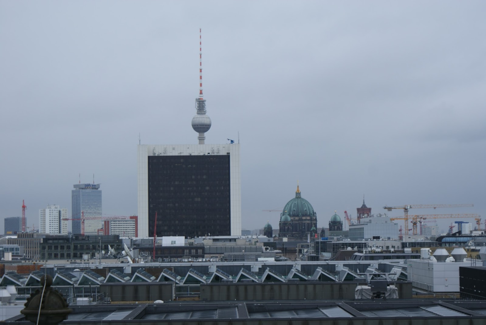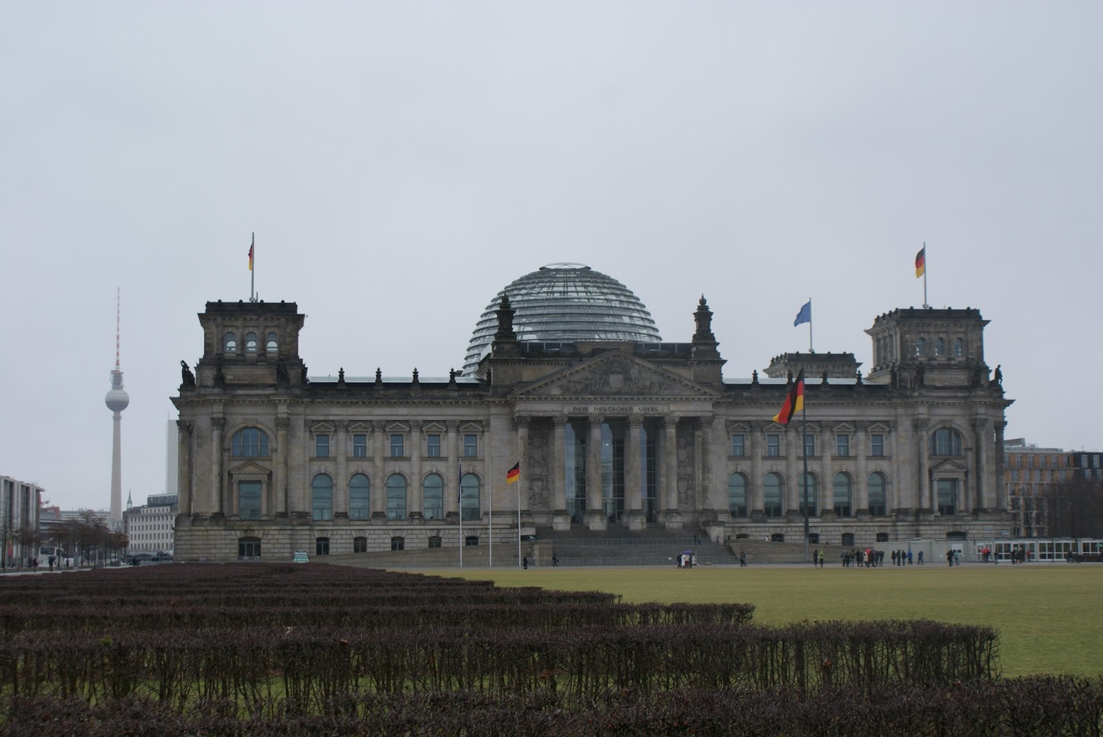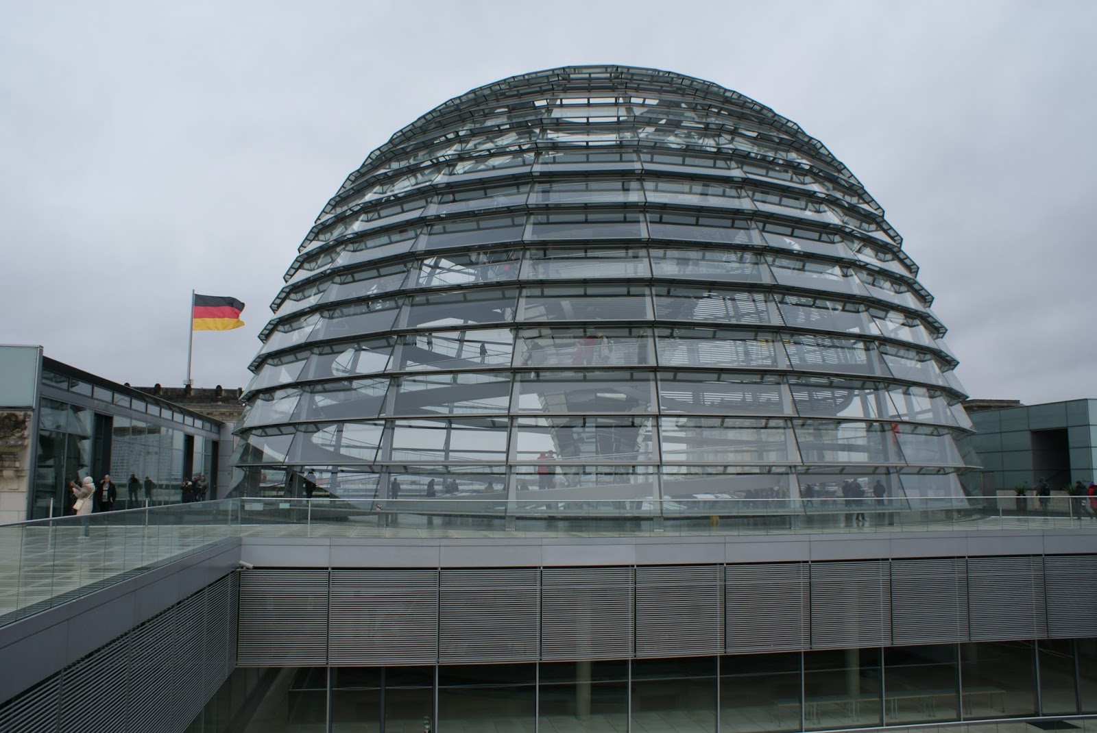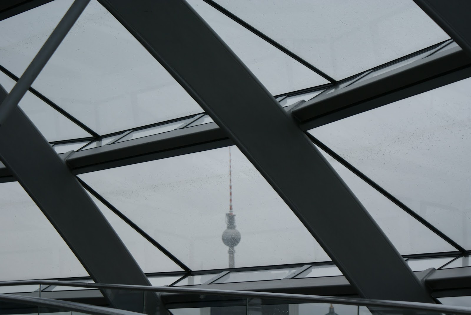 Enquanto subimos a rampa, e nos maravilhamos com a arquitectura da cúpula, vamos recebendo informação sobre o edifício e a envolvente urbana. Aproveitamos também para ver as vistas. De um lado avista-se o elegante edifício da Casa das Culturas do Mundo e o amplo Tiergarten, despido e em tons secos por aqueles dias invernosos.