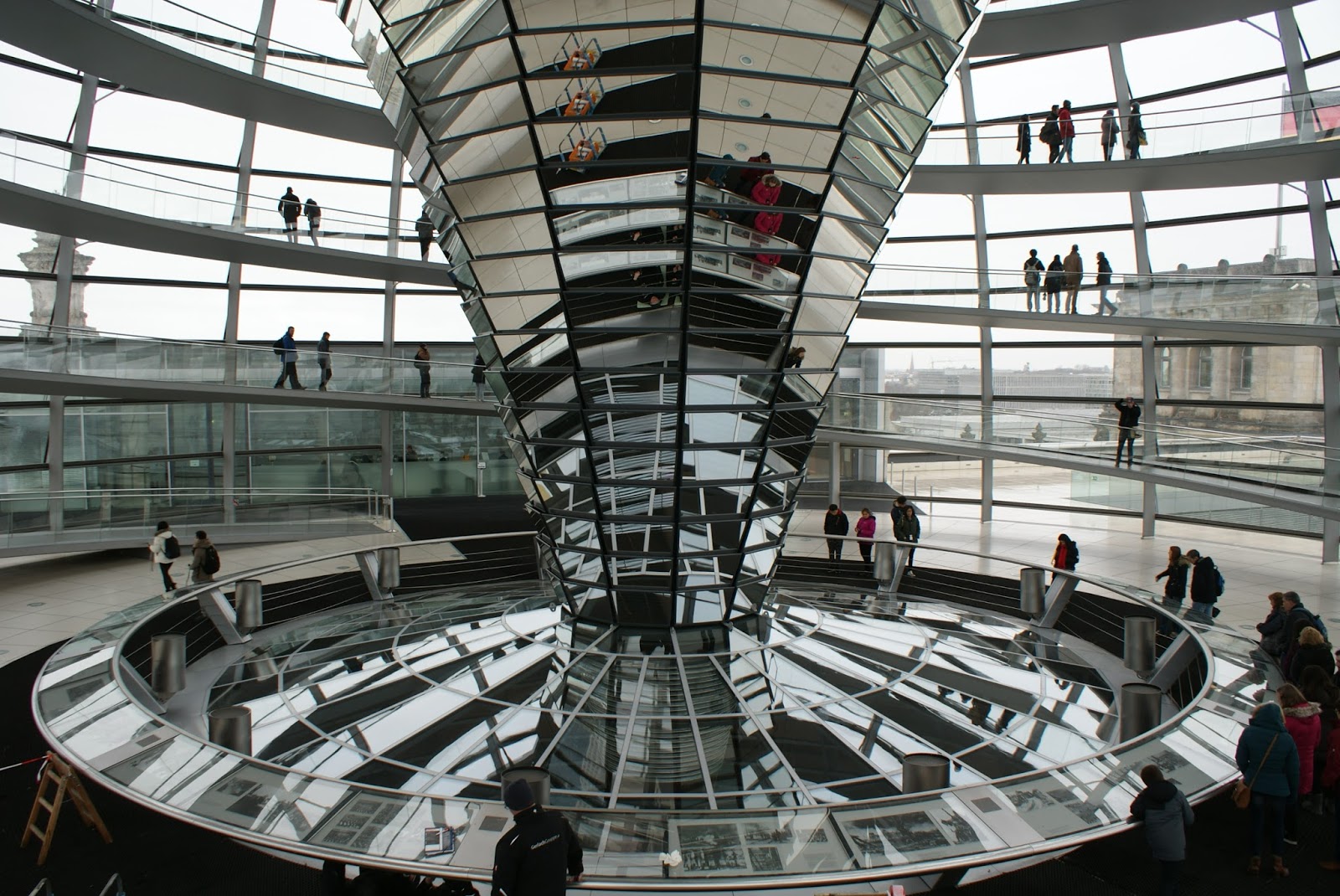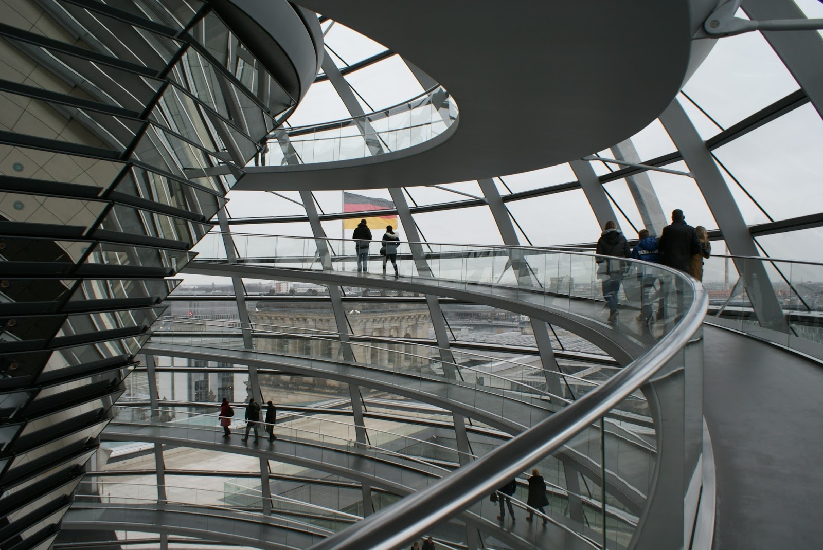 Subimos de elevador e chegamos à base da cúpula. Acompanhados do autoguia, iniciamos a subida de 230 m da rampa em espiral, que se desenvolve à volta de um cone envidraçado que foi criado para desviar a luz natural para a sala do plenário, que fica abaixo da cúpula. Como metáfora da transparência e abertura política, da cúpula é possível ver as actividades que se desenrolam na sala do plenário.