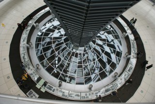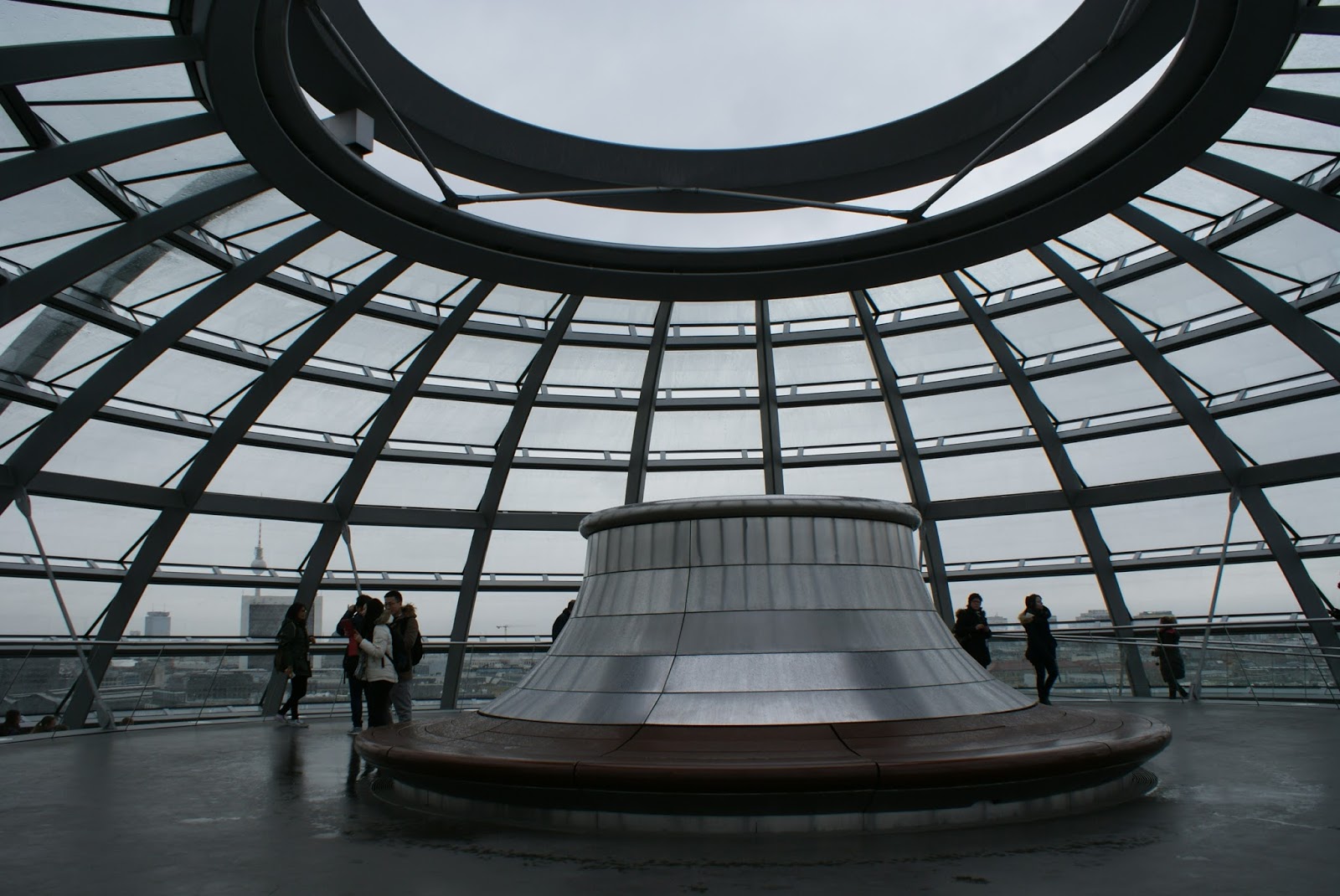 Chegando ao topo percebemos que a cúpula é aberta, tudo por questões de eficiência energética, já que, por exemplo, a água da chuva é aproveitada para a refrigeração do edifício e o ar viciado sai pela cúpula.