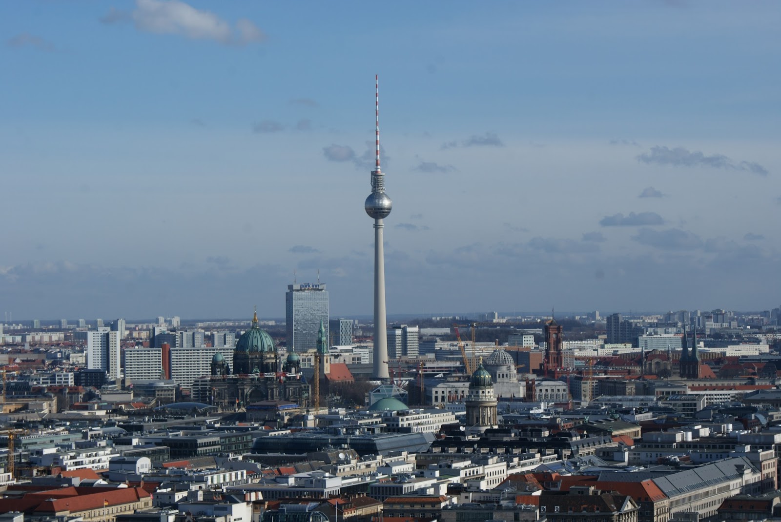 A Berliner Ferbsehturm, ou Torre da Televisão, e a área da Alexander Platz e da Ilha dos Museus, com a cúpula da Catedral de Berlim.
