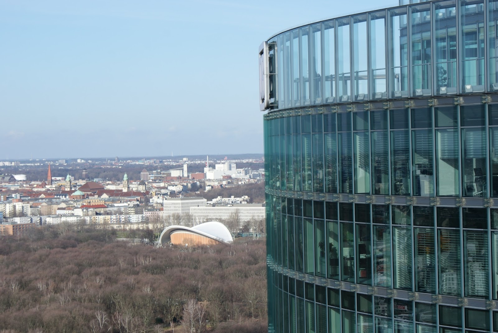 Ainda a repormos o equilíbrio perdido com a velocidade estonteante do elevador, avistamos do topo a Casa das Culturas do Mundo, de Hugh Stubbins, no Tiergarten.