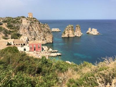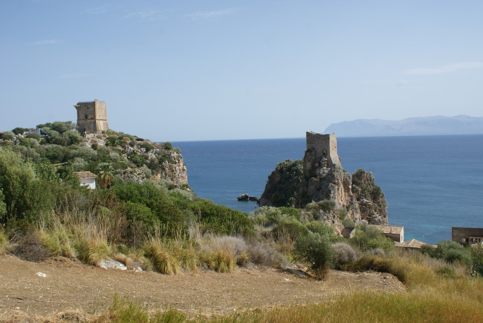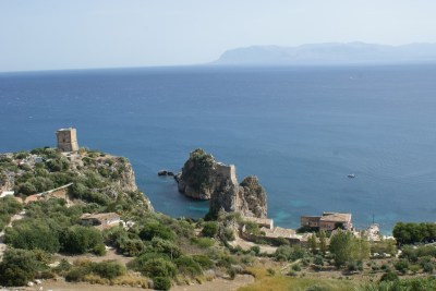 Dois dos faraglioni são encimados por torres históricas defensivas, as quais combinam com uma terceira na parte de cima da vila de Scopello.