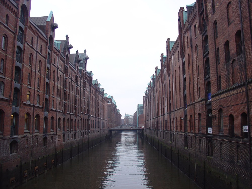 Os canais sucedem-se e atravessada mais uma ponte chegamos a Speicherstadt, literalmente a “cidade dos armazéns”. Em pleno porto, foi construída entre 1883 e 1927, na sequência do grande fogo e, ainda que utilize a madeira para as fundações dos seus edifícios, veio trazer como novidade a criação de um novo estilo arquitectónico pelo uso do tijolo como material dominante.
