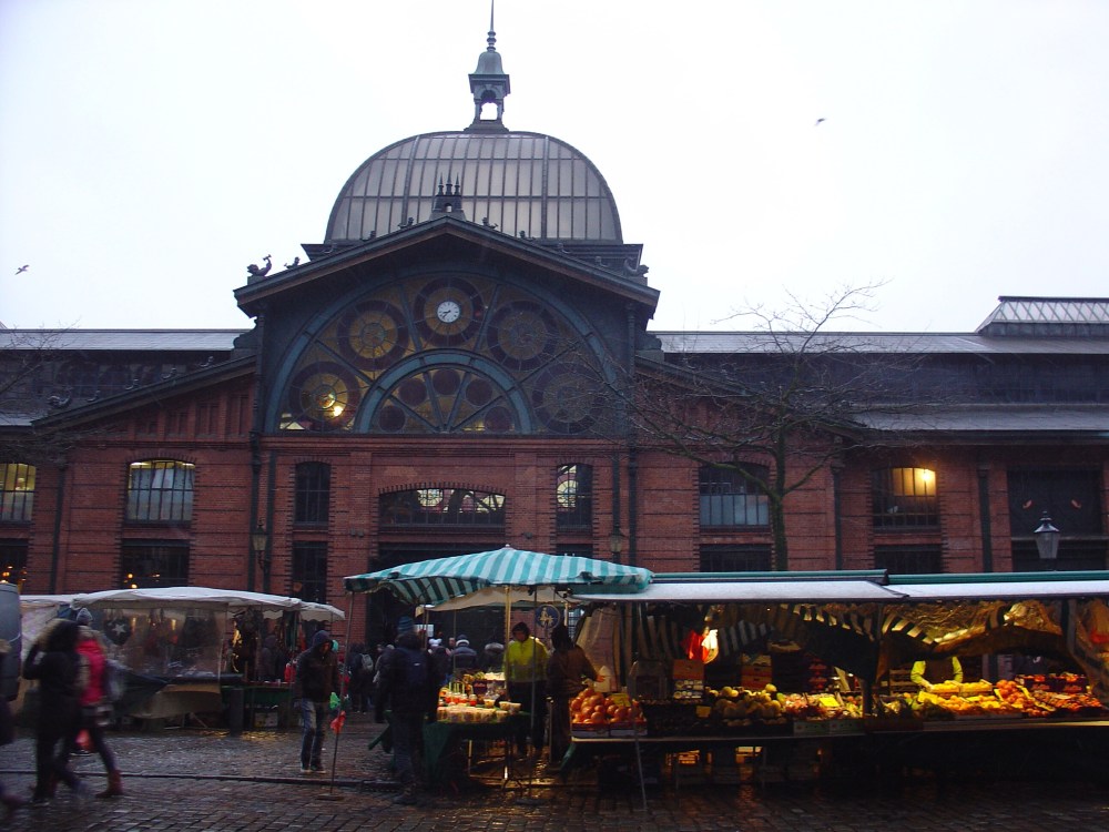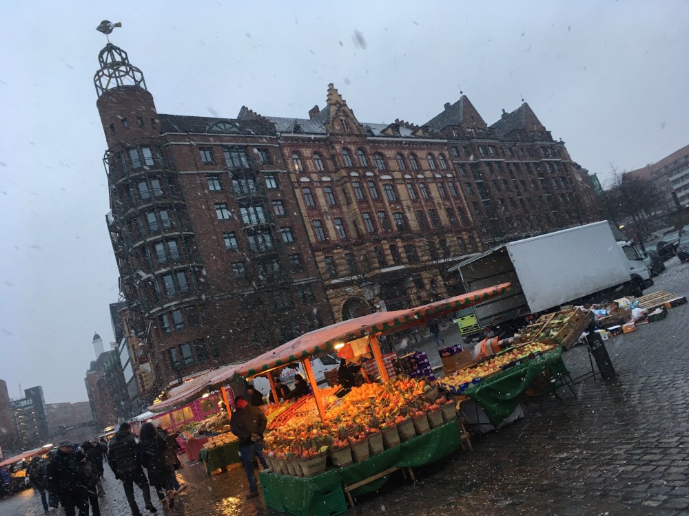 Se estivermos na cidade a um domingo, é imperdível levantar bem cedo, ou nem sequer chegar a deitar, para dar um pulo até ao Fischmarkt. O início da manhã não estava nada convidativo, temperatura negativa e muita neve, mas lá sai, acompanhada de muitos mais, para conhecer o mais famoso mercado do peixe alemão. Surpresa número um, o edifício do mercado está, nas manhãs de domingo, transformado em palco de concertos, uma espécie de after party para a qual todos estão convidados, ou seja, aqueles que ainda não terminaram a noite e aqueles que estão a começar o dia. E para isso, para além da música, temos diversas bancas de comida e bebida para repor ou pôr energias. A salsicha é forte em toda a Alemanha, mas é a sanduíche de peixe a obrigatória neste canto à beira mar. Isto é o que se passa no interior. Lá fora, vemos as bancas de fruta, legumes e peixe, tudo alimentos frescos. Ou, talvez seja melhor dizer, nevados e congelados pela temperatura natural. A neve não parava de cair, mas nem por isso as ruas à volta do mercado às 8:00 da manhã deste domingo deixavam de estar vazias.