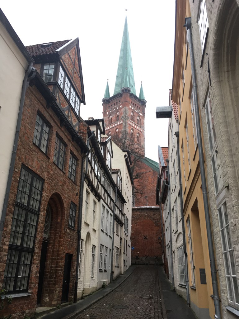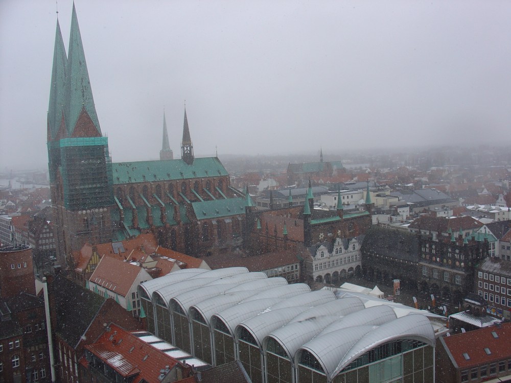 À beira do Trave vamos conhecendo os primeiros exemplos de edifícios que fazem desta uma cidade distinta e descobrimos a igreja Sankt Petri à espreita. De fachada de tijolo e interior branco hoje vazio (a igreja já não está em funções, antes se transformou em local de eventos culturais), é para lá que nos dirigimos para subir à sua torre, a mais de 50 metros de altura, e ganharmos um panorama fantástico de toda a Lübeck. A neve não impediu que pudéssemos distinguir com clareza as seis casas irmãs de sal, todas elas diferentes no seu formato, nem que pudéssemos ter o primeiro contacto com as muitas torres de igrejas e com a Praça do Mercado.